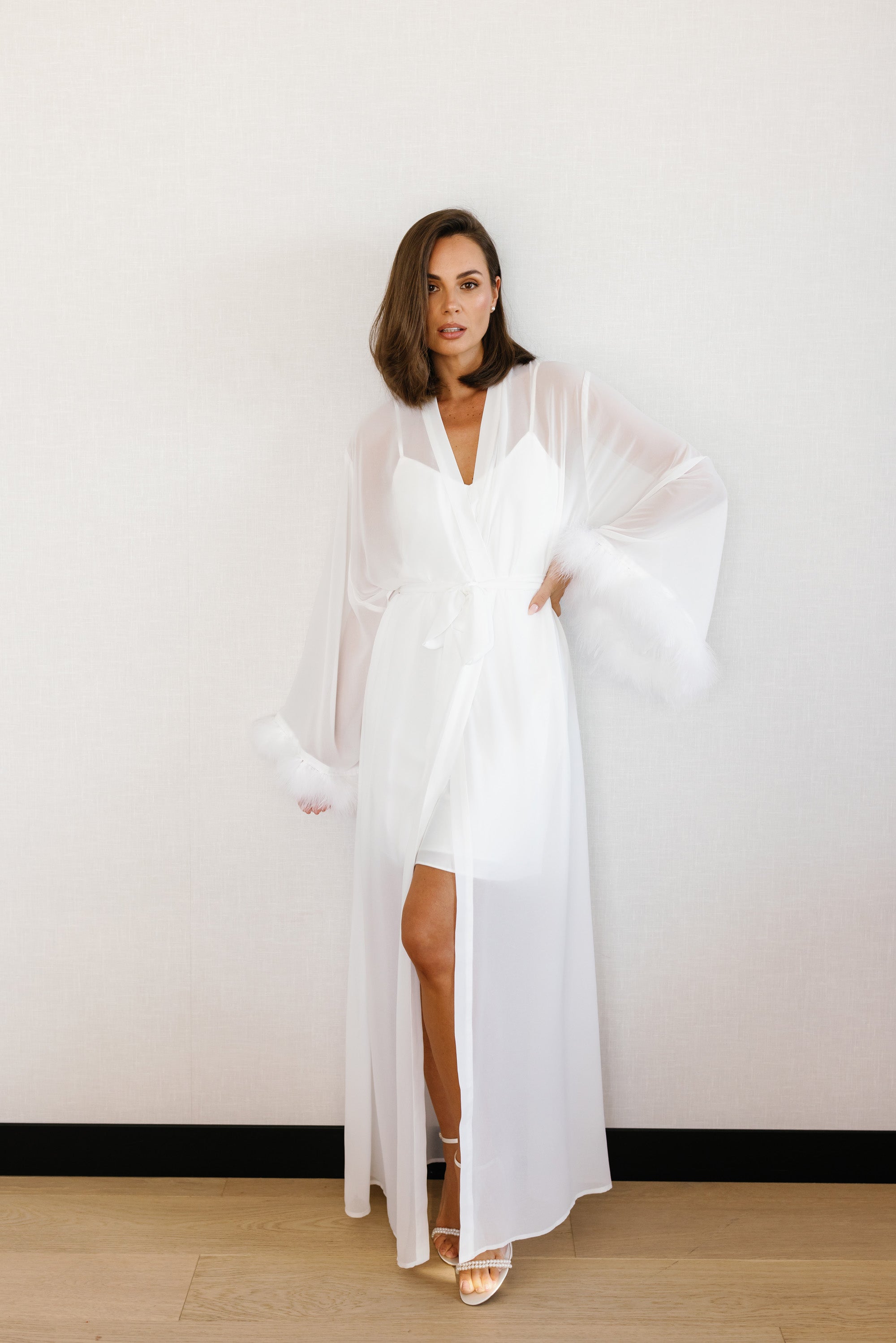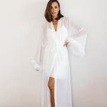 A woman sitting elegantly on a bench wearing a white bridal maxi robe with feather trim on the sleeves.