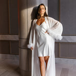Embrace the enchantment of old Hollywood glamour with our luxurious bridal robe, designed for the bride who wishes to feel like a star on her special day. This robe, with its opulent feather detailing on the sleeves, evokes the elegance and sophistication of a bygone era.