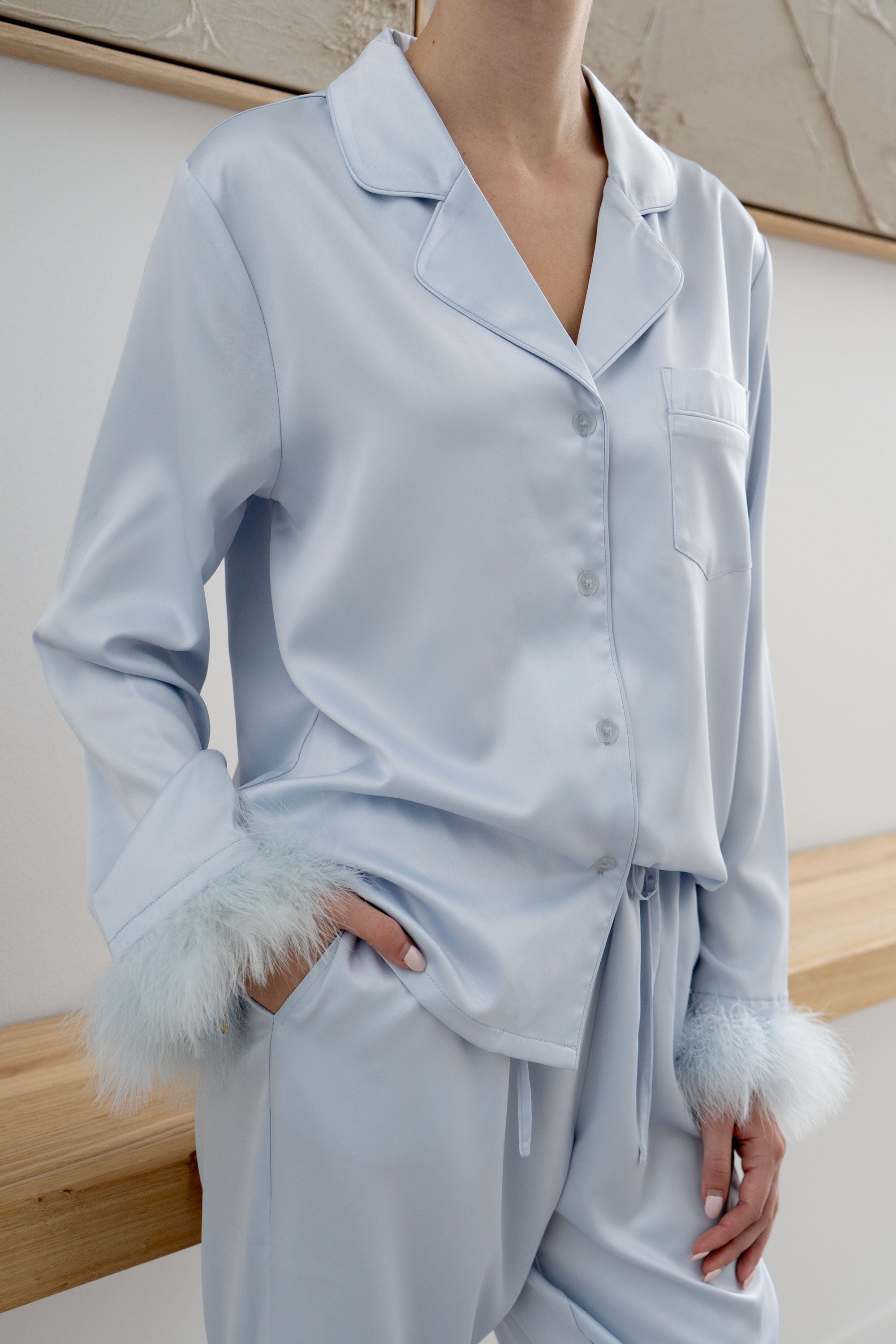 Taylor Satin Feather Bridal Pyjama Set Soft Blue