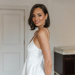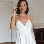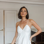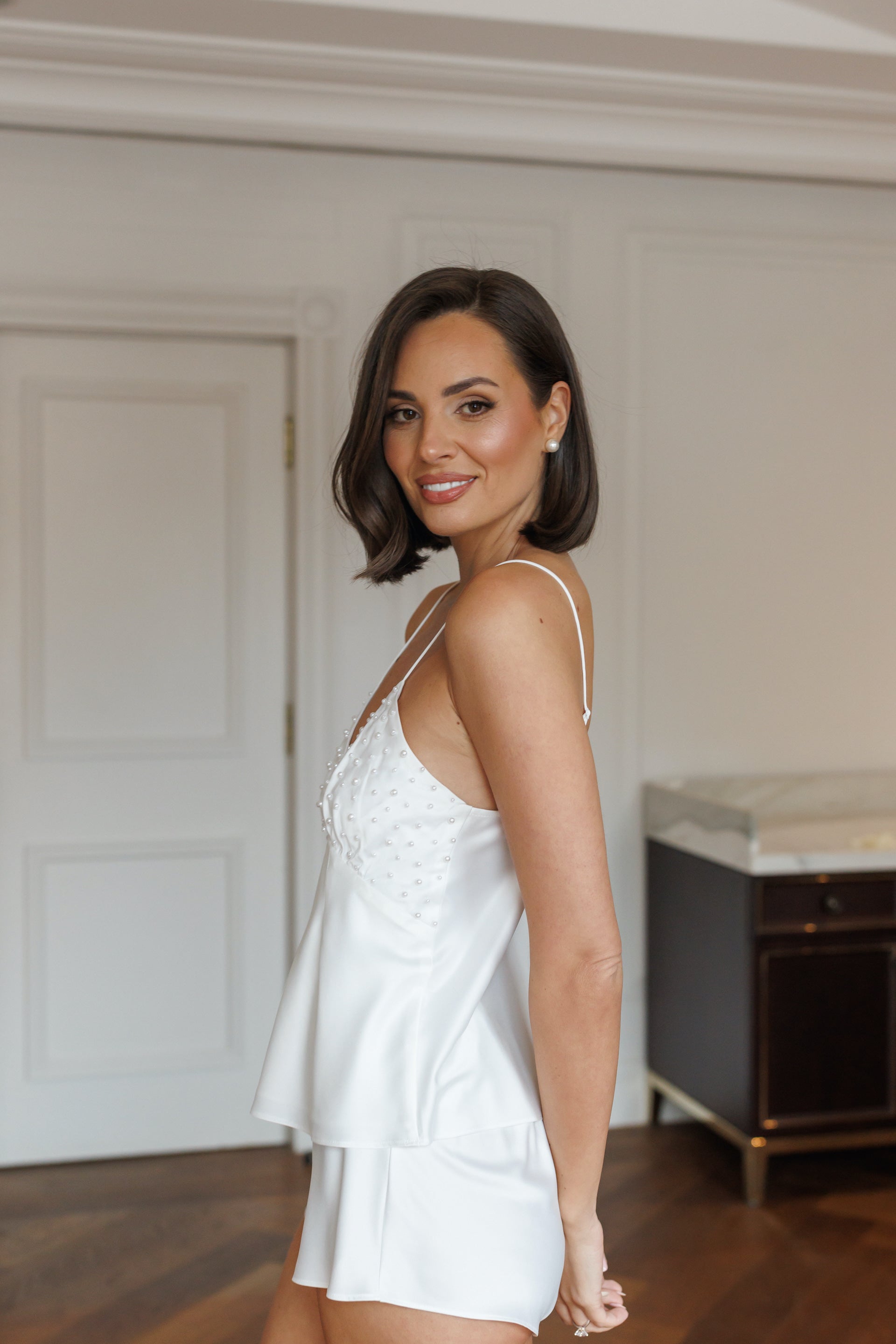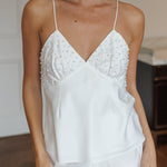 Behold the rare beauty of our Elodie Pearl Beaded Cami Set, crafted from our exclusive LR satin and adorned with delicate hand-beaded pearl panels over the bust. Experience a sense of cherished elegance and timeless allure. Complete your show-stopping bridal ensemble by pairing it with the Louise Pearl Beaded Robe.