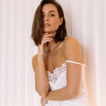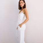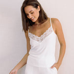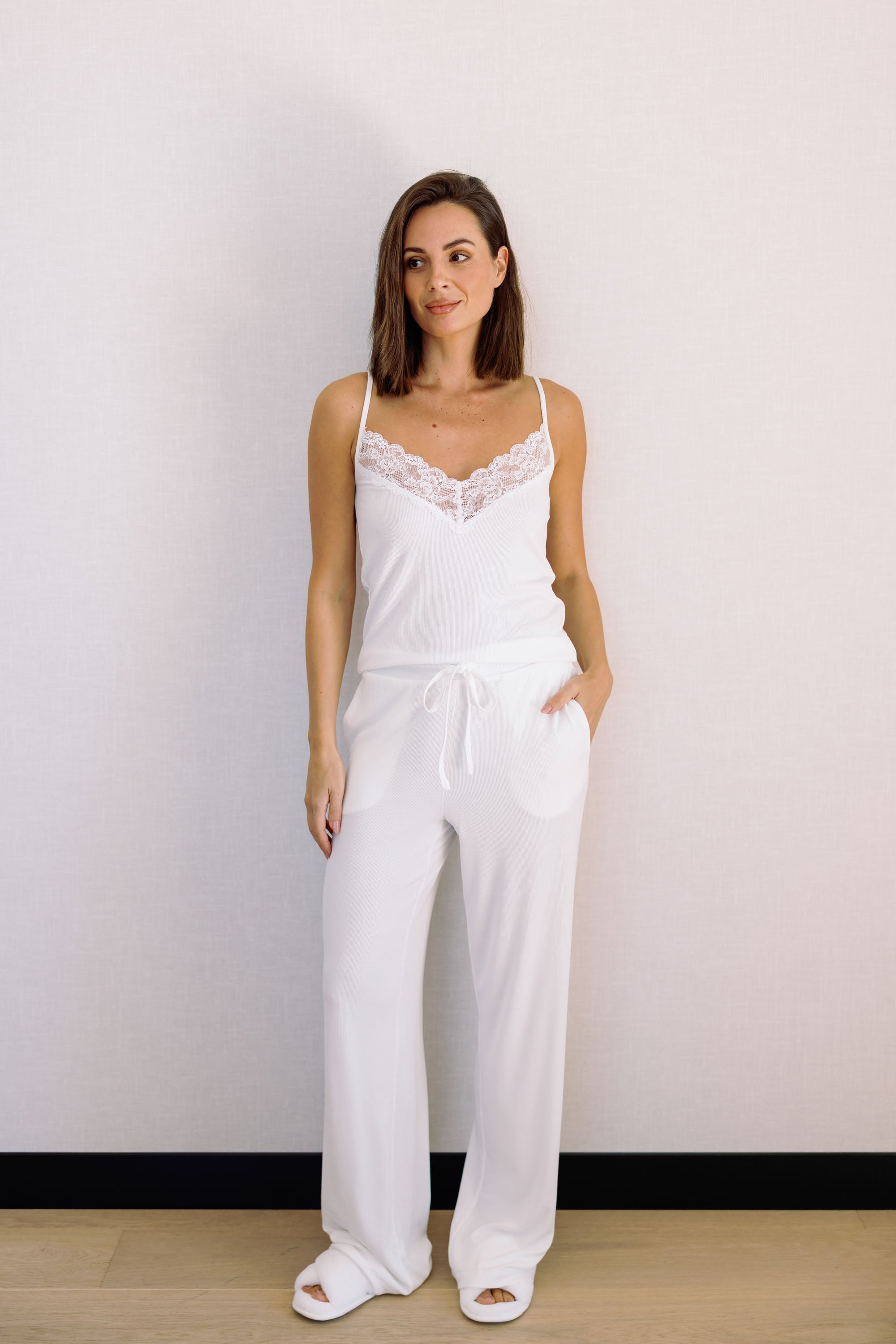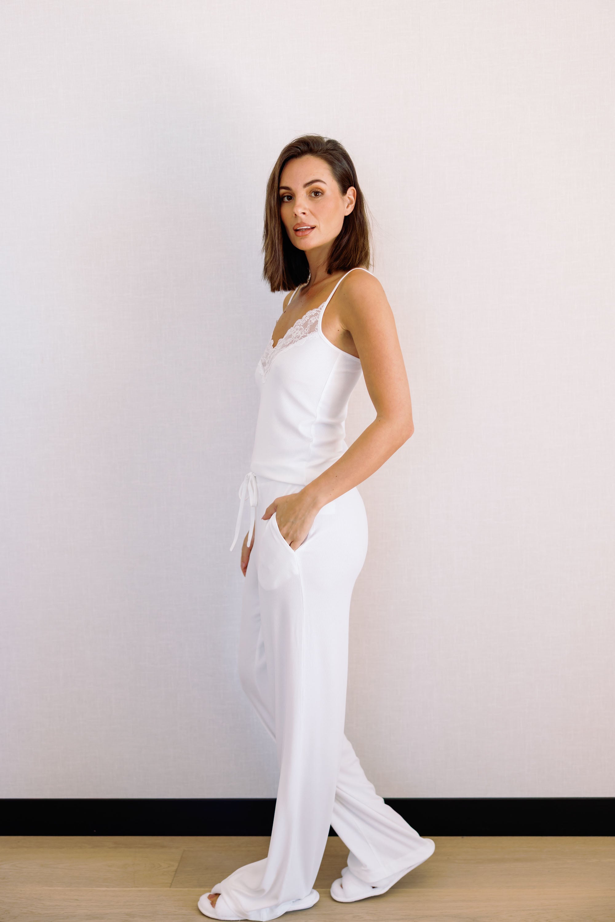 Discover the beauty of effortless loungewear with our Colette Lace Trim Modal Cami and Pant Set in White. Crafted from silky modal fabric with delicate lace trim, this set combines breathable comfort with refined style. The fluid drape of the cami and full-length pants creates an elegant silhouette for sleep, lounging, or gifting.