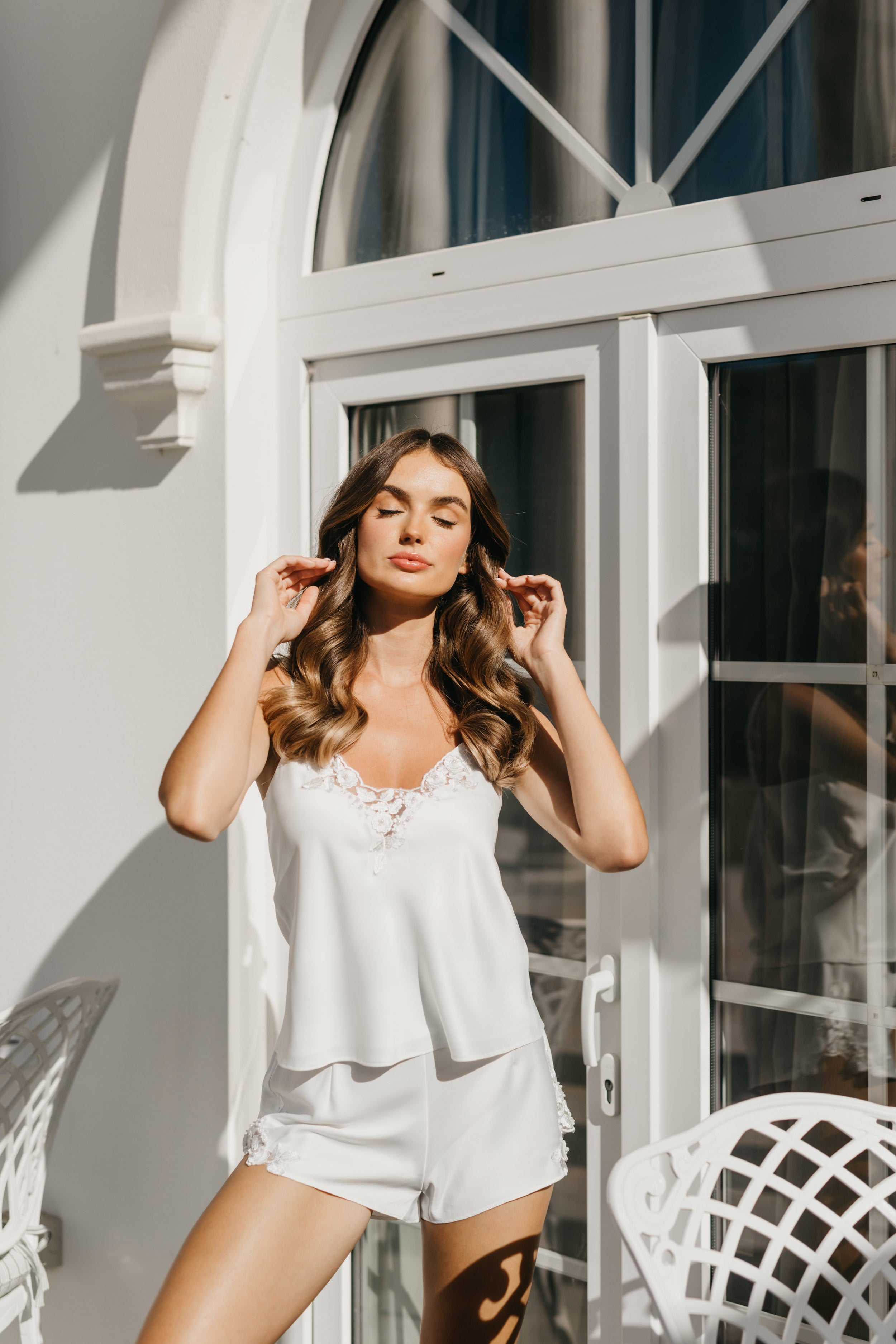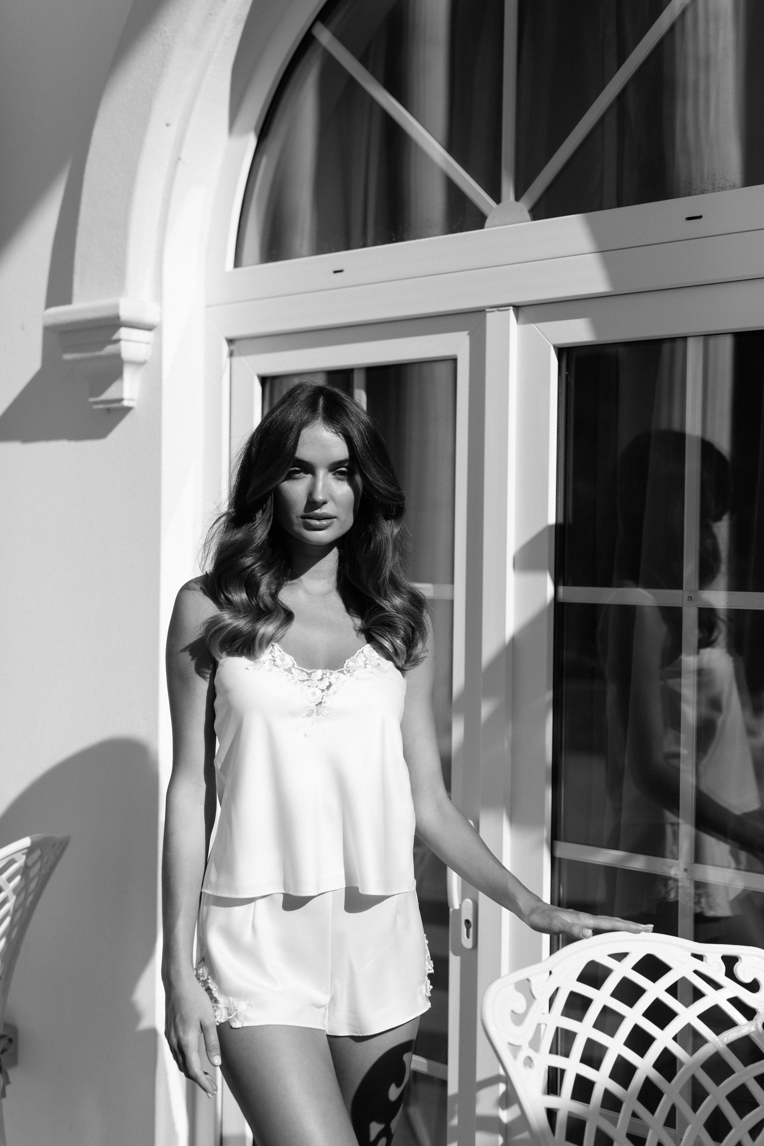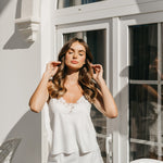 Satin bridal set with with lace trims adorned with 3D florals, pearl beads and scalloped edge at top neckline and side of shorts.