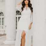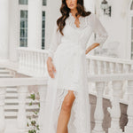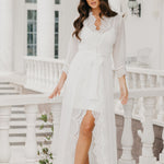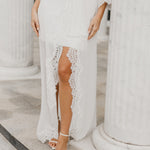 A romantic combination of both sheer fabrication and scallop edge lace trim wrapped down centre front and hem, exclusively designed by Le Rose. Our Hannah Maxi features a plunging neckline and tulip hem silhouette. Centre front fastening with outer waist tie.