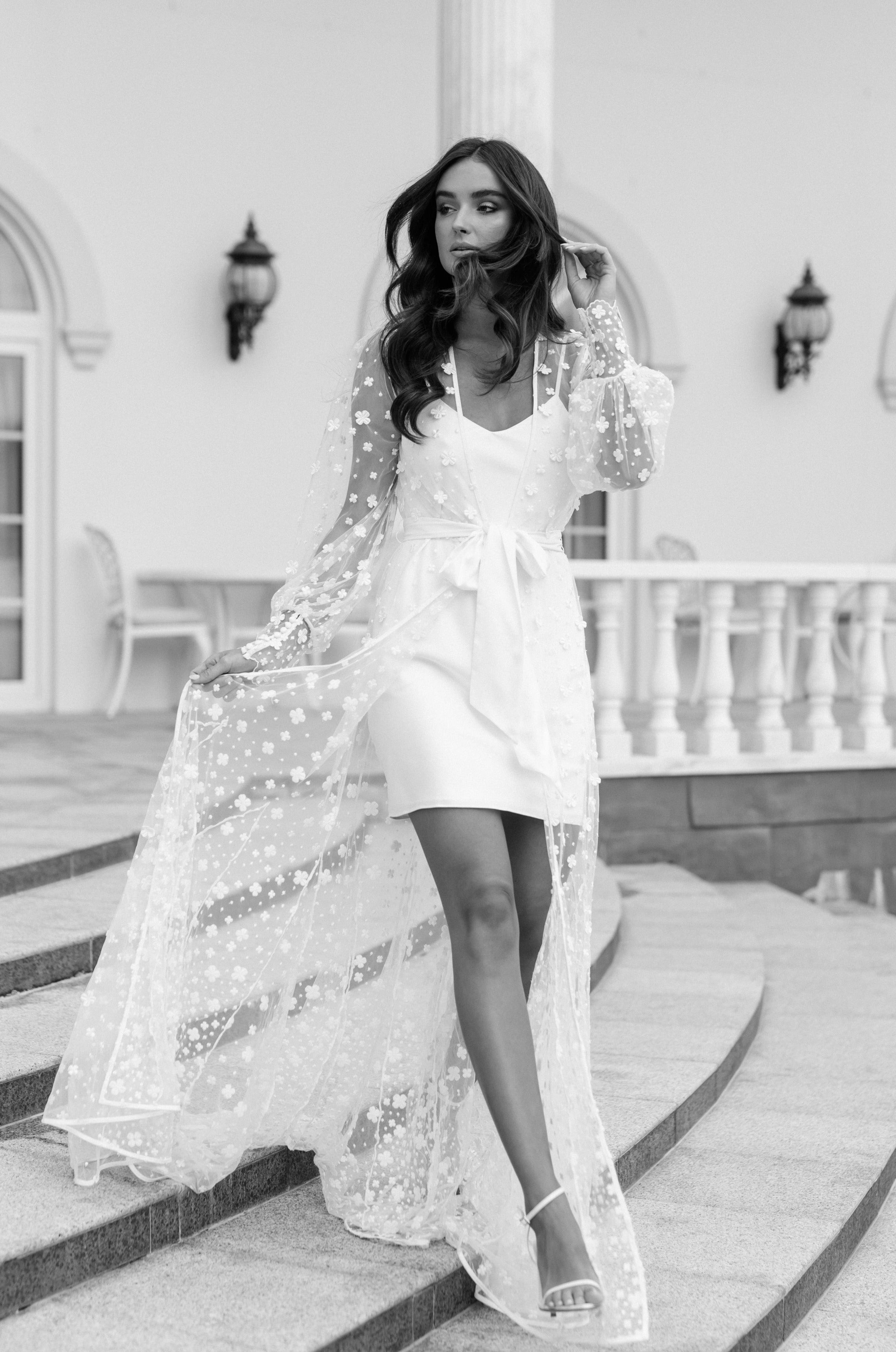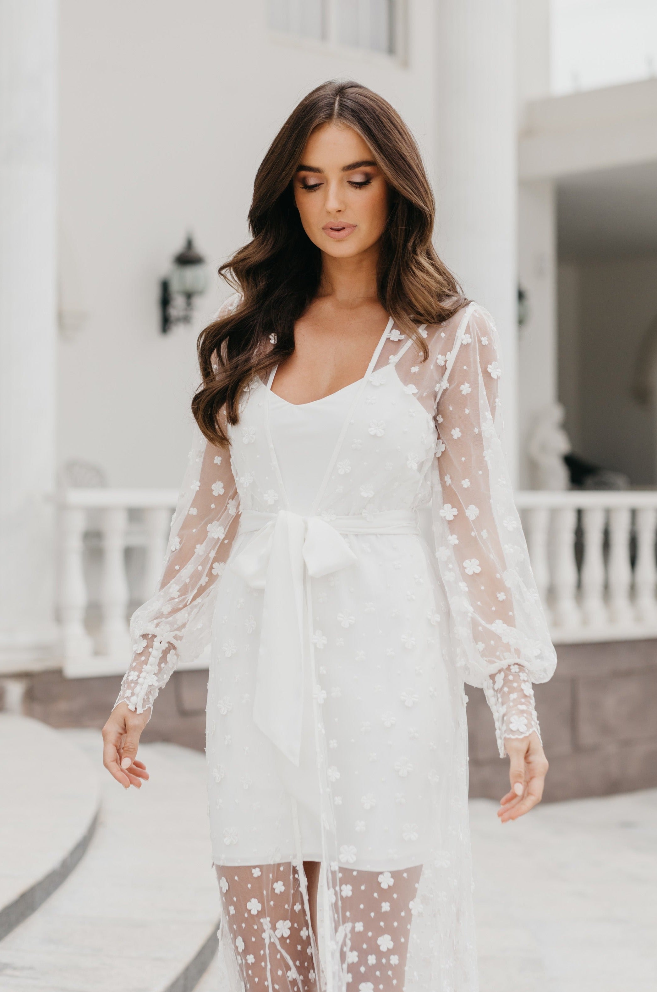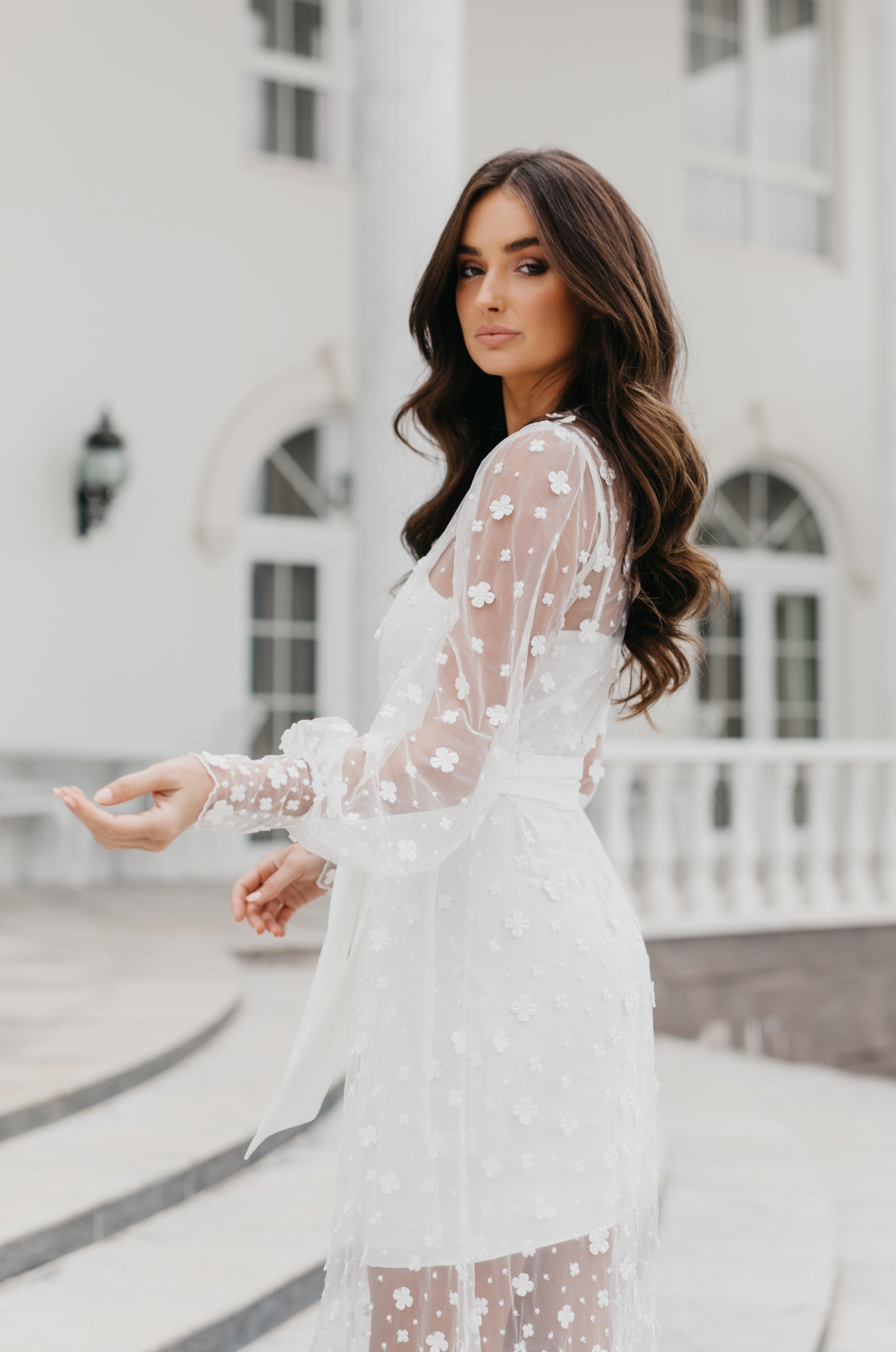 A whimsical all over 3D clover lace design exclusively designed by Le Rose. Blouson sleeve with extended cuff and button detail... Centre front fastening with waist tie.