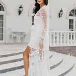 Give into whimsy and wonder in our Imogen Forget Me Knot Lace Maxi with Slip. Designed and developed by Lerose, you'll feel enchanted by this whimsical all over clover lace design. The Imogen is adorned with a captivating scallop lace trim and a romantic detailed lace cuff, exclusive to LR. Finished with a full hem for a princess effect, you'll feel and look like royalty...