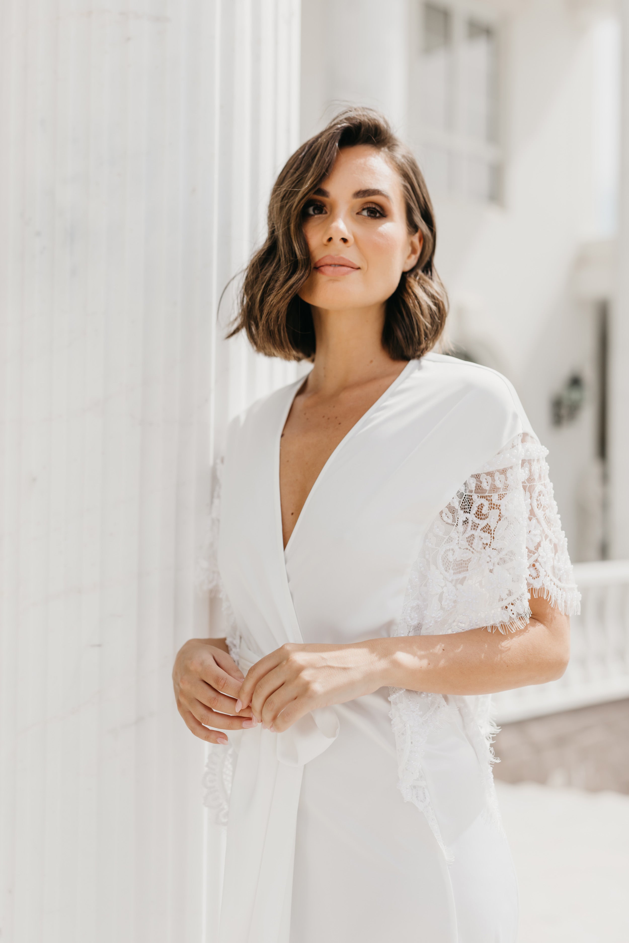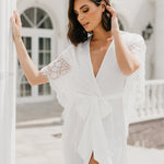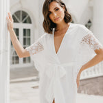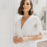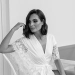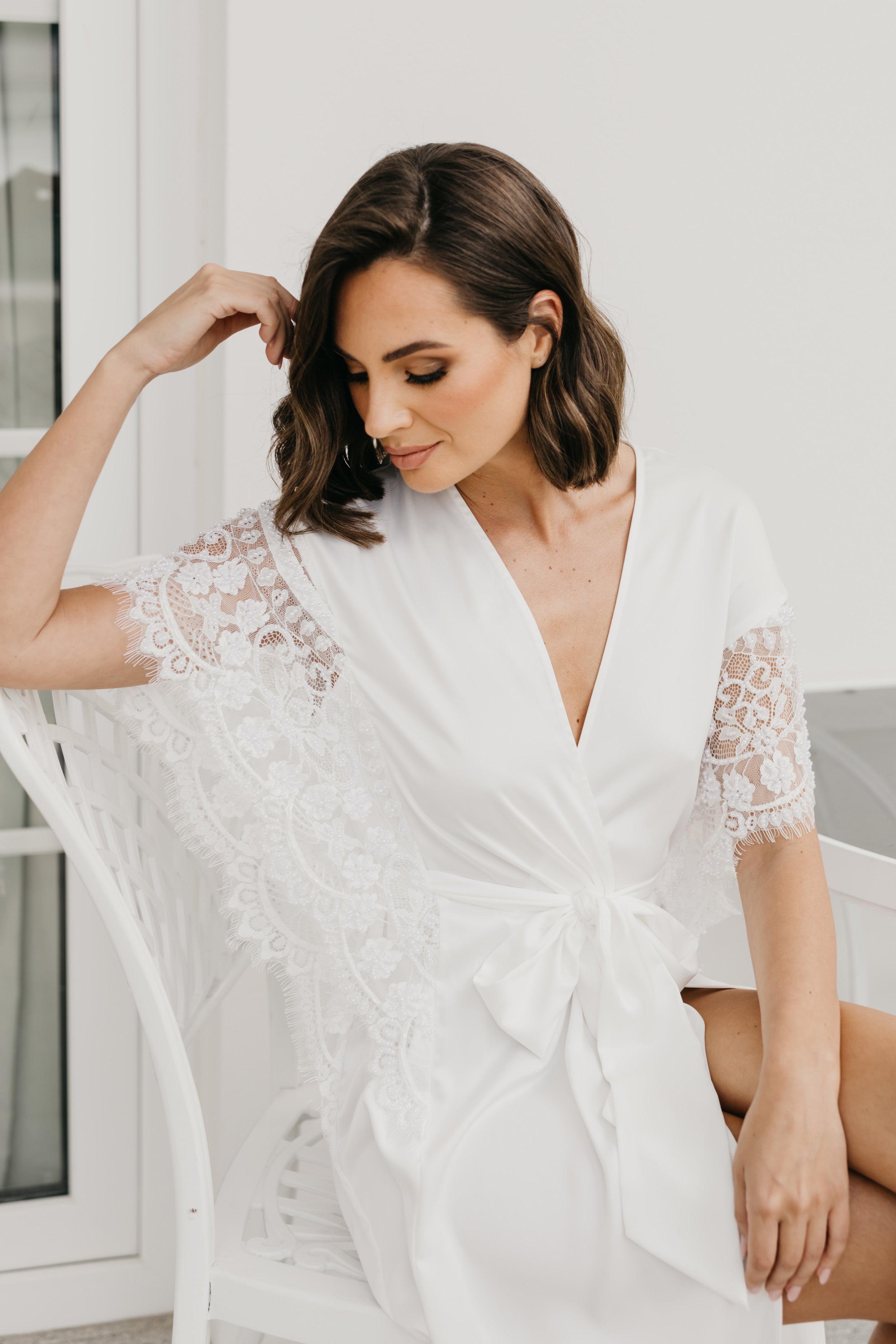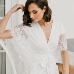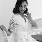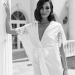 An opulent combination of both luxe satin fabrication and hand beaded lace detailing exclusively designed by Le Rose. Hand beaded pearl lace adorns the sleeve cascading down to the waist. The robe includes both an internal tie and detachable outer waist tie.