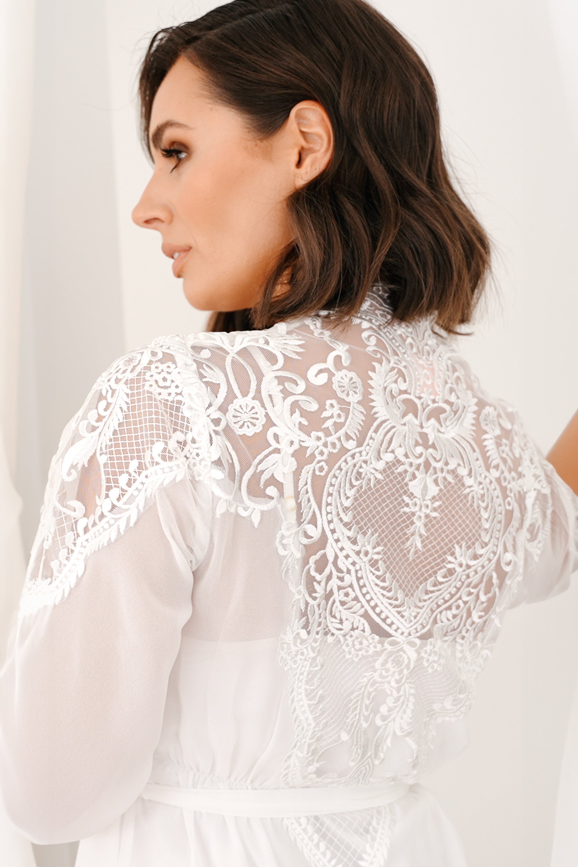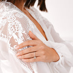 Our Veiled Rose collection is an ode to the mystery of beauty and femininity. Almost secret details draw the gaze and hold it. With quiet confidence steal the focus of any room. This maxi is an ode to feminity and it's mystery. The Luna lace back maxi is the ultimate bridal robe which offers endless possibilities and memories that last a lifetime.