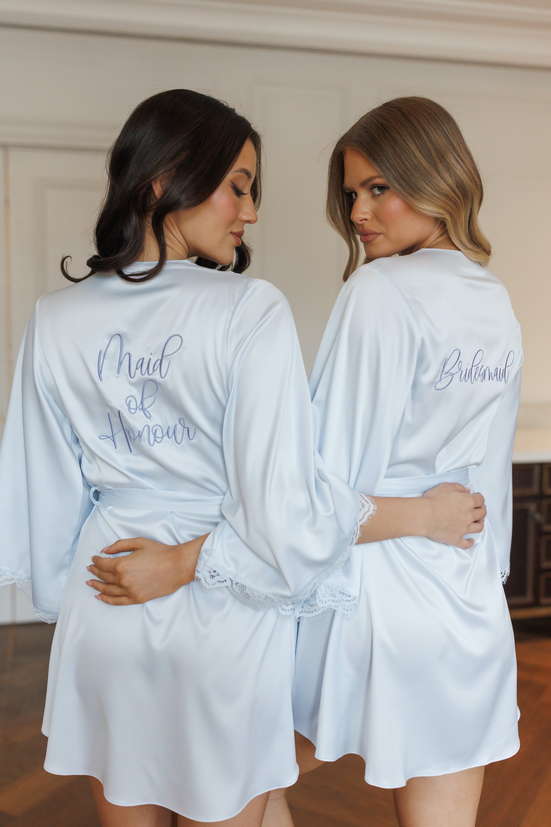 Delight your ladies with luxury in our Talulah Lace Trim Robe... Available in three magical hues, this Satin Bridal Party Robe showcases intricate lace detailing on the neckline and hem. An essential touch of elegance for those celebrating a timeless wedding.