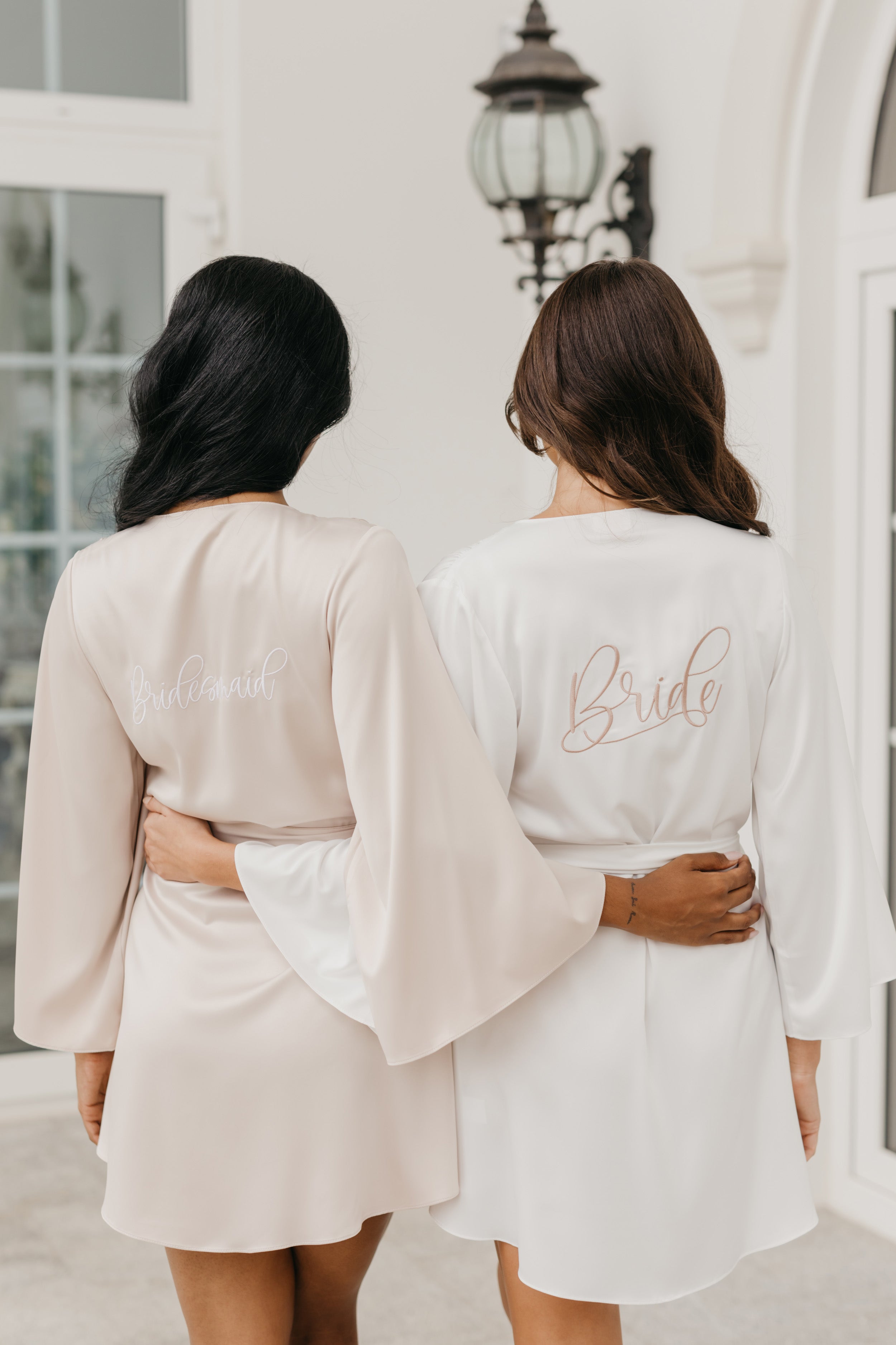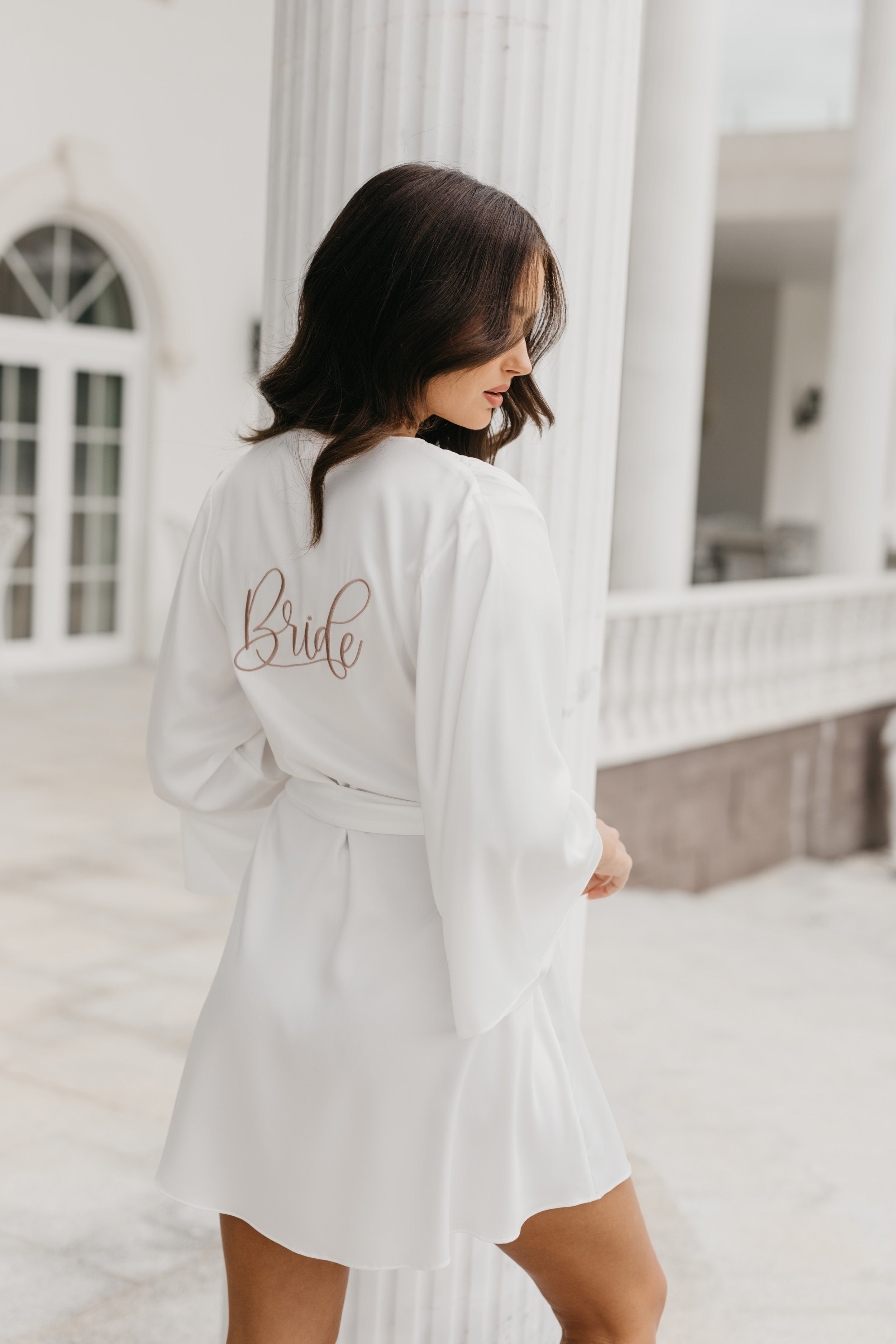 Bridal robes and sleepwear are packed in soft white satin gift bags with ribbon and a gift card, then delivered in postal sachets.