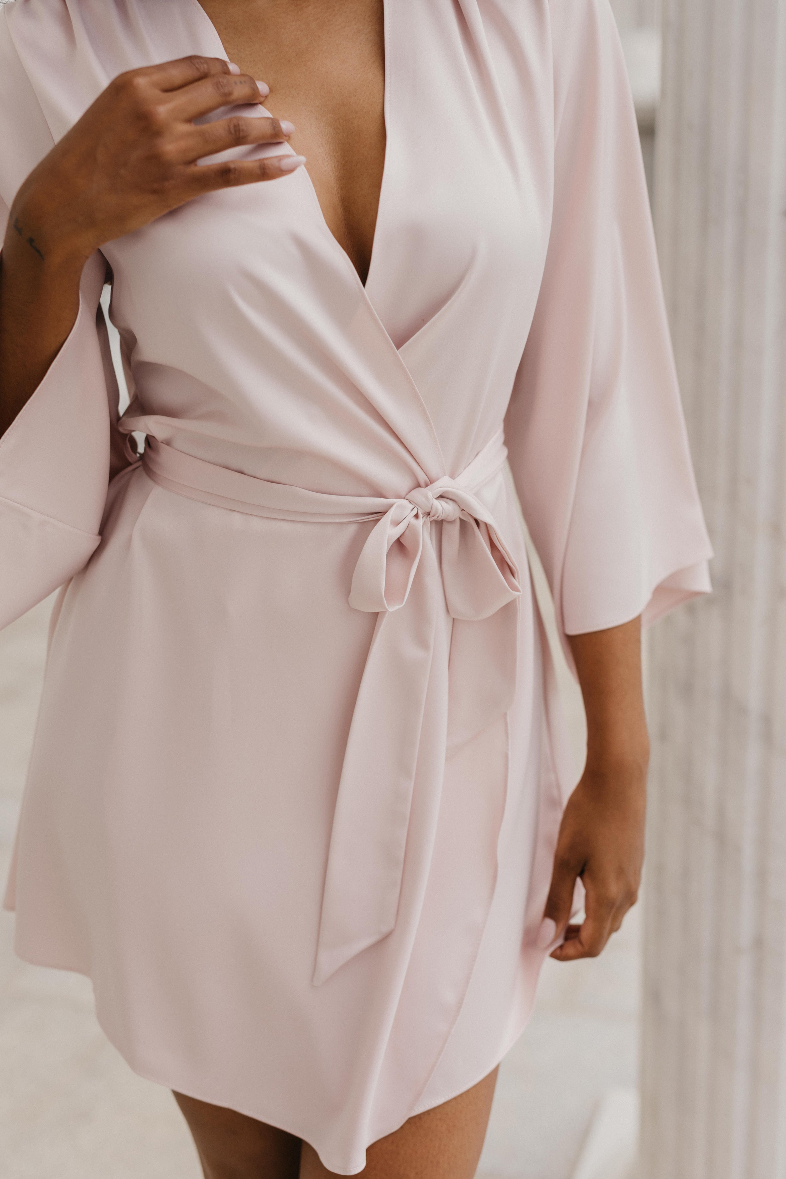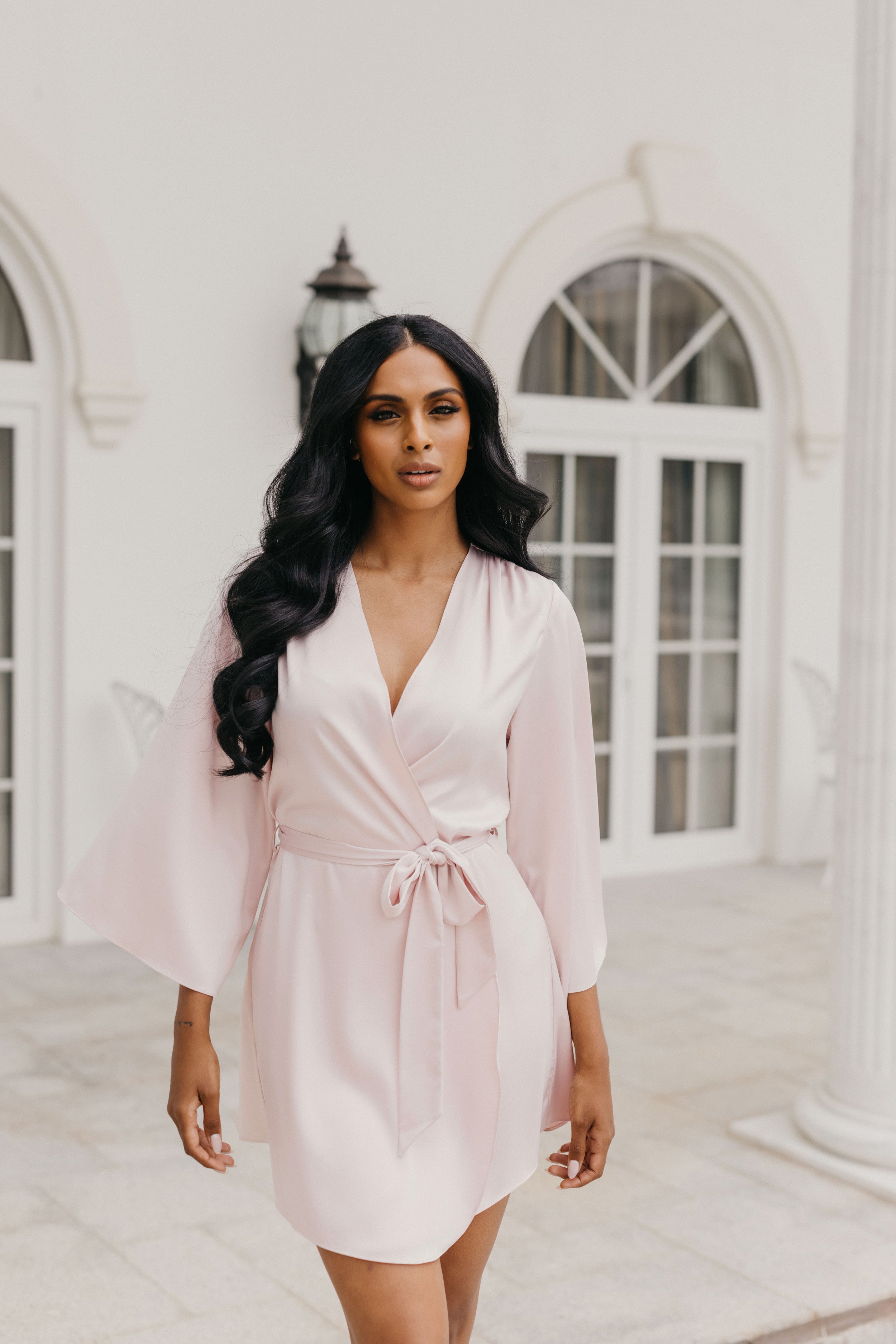 Made from our LR exclusive satin, it has just enough stretch to create the perfect drape for the angel wing sleeves and floating petal hem. Delicate gather details adorn the shoulders.