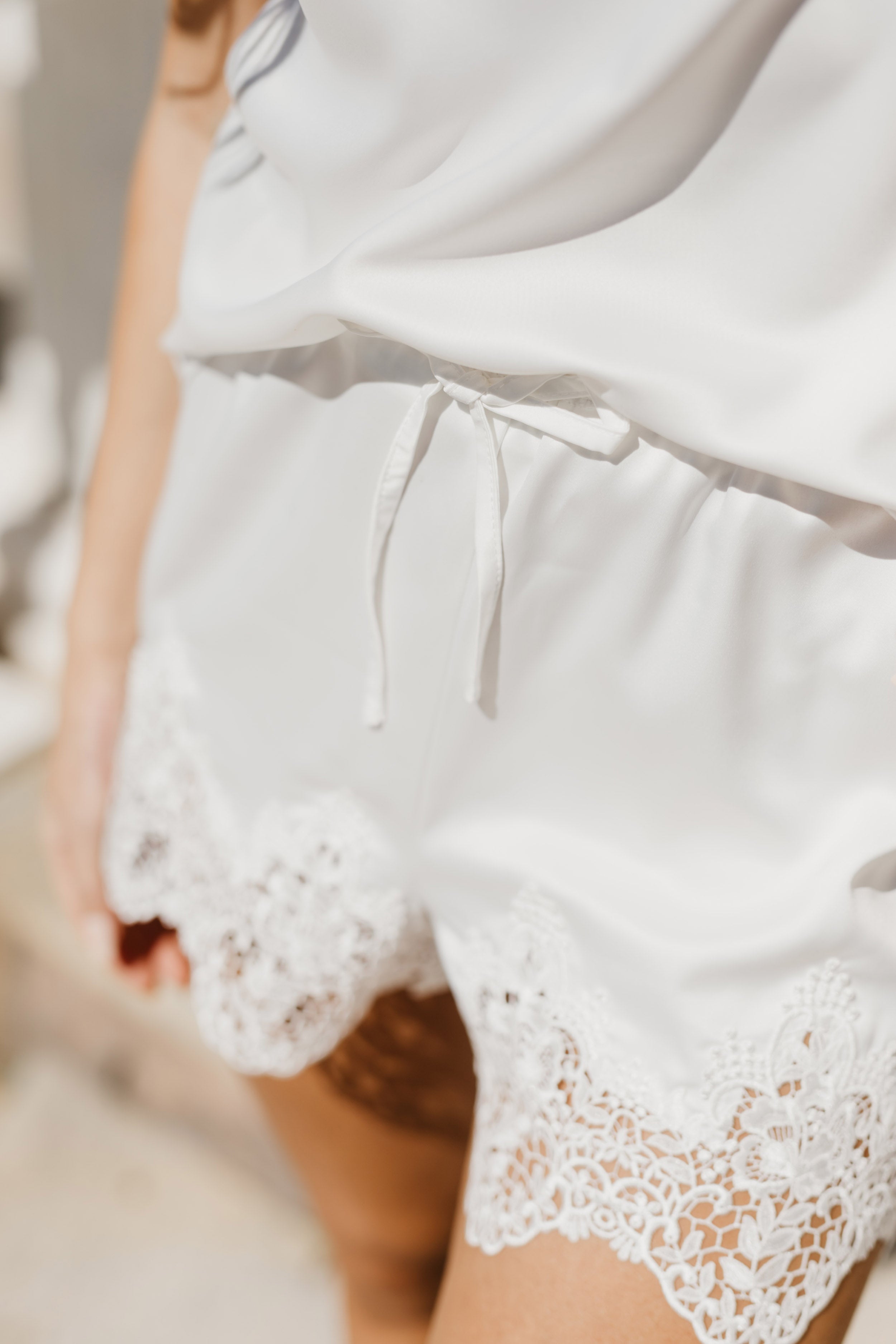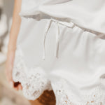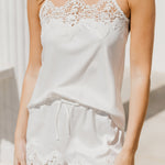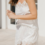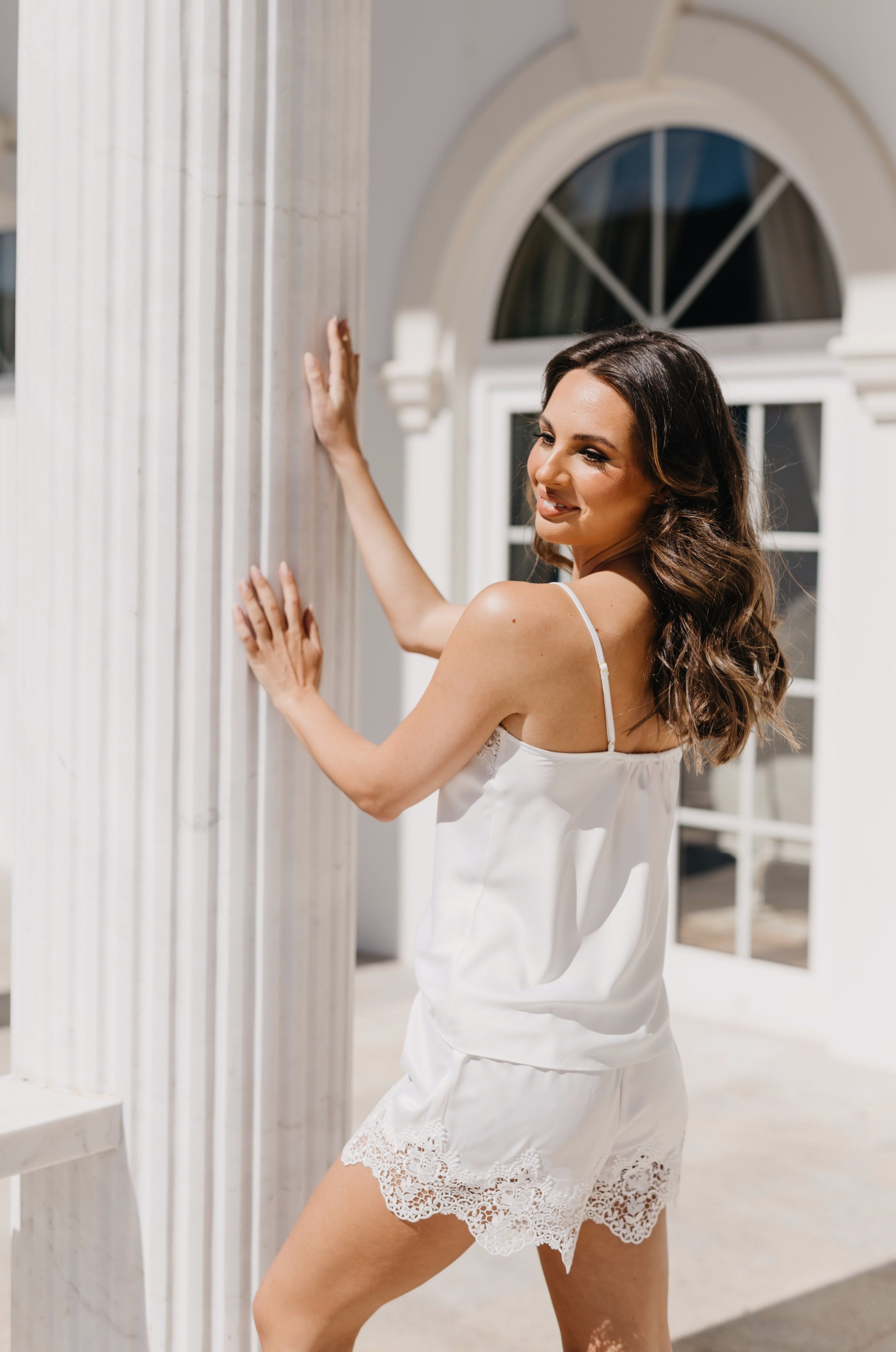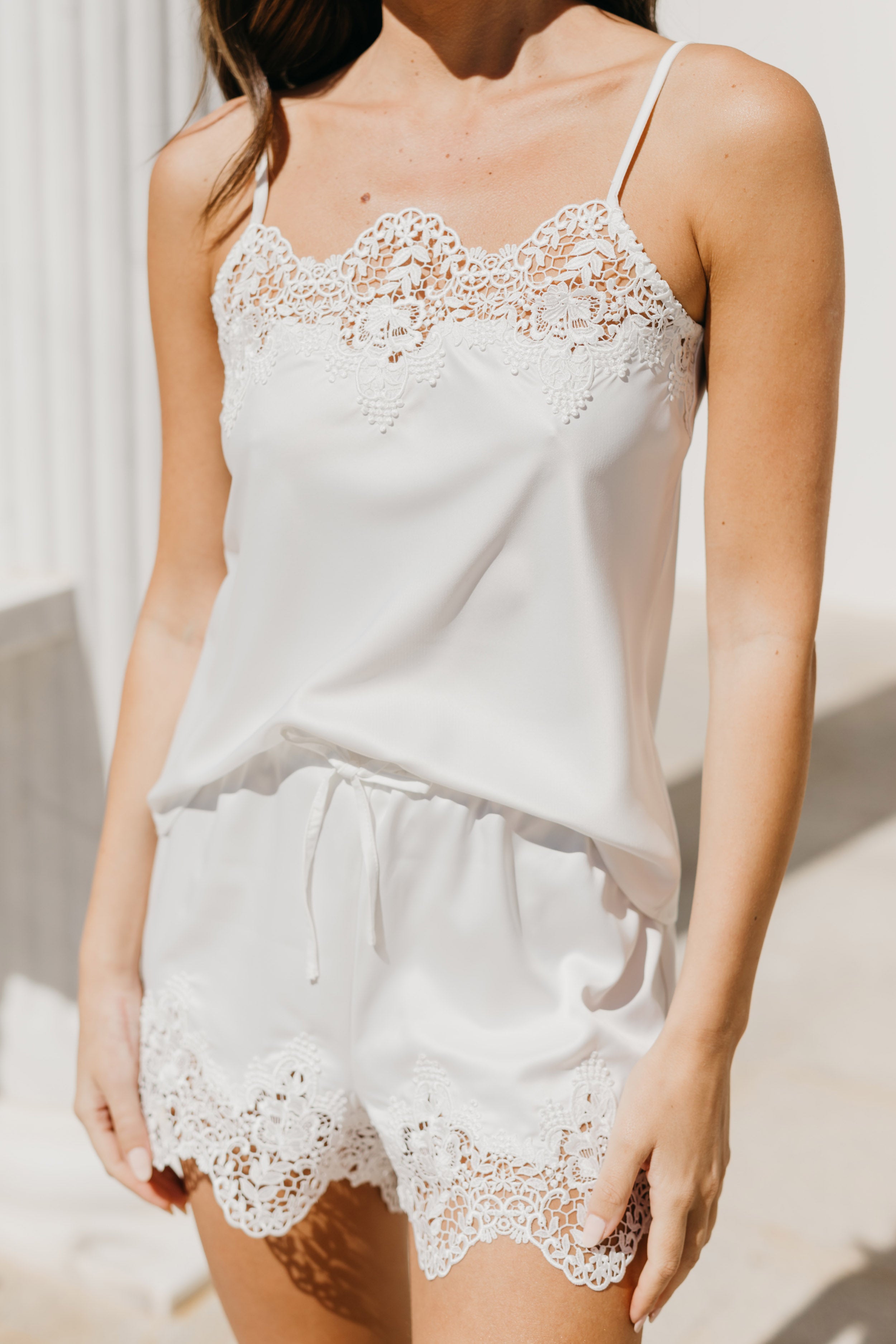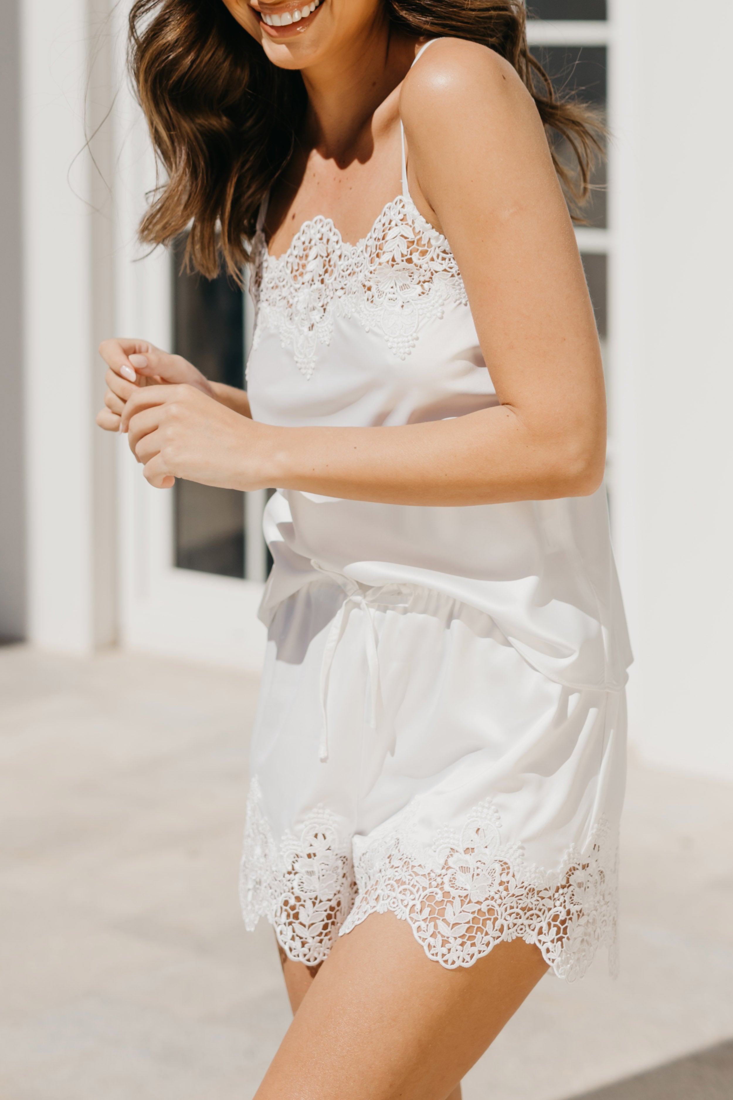 A romantic combination of our luxe matt satin and exclusive detailed lace trim around neckline and hem of shorts.