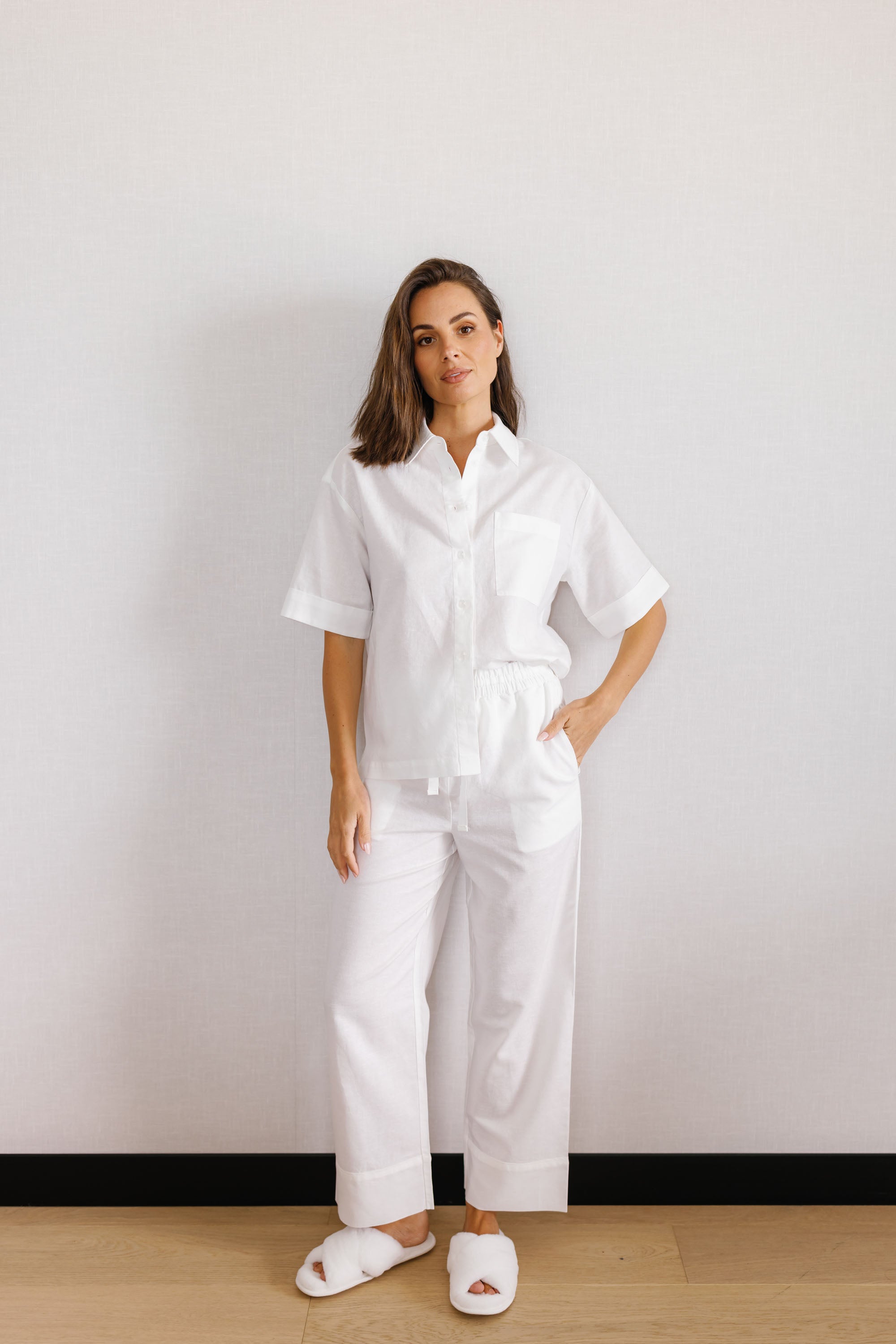 Slip into the ultimate combination of comfort and sophistication with our long linen pyjamas, specially crafted for the bride. Perfect for a serene morning spent with your bridal party, these soft, airy pyjamas are ideal for lounging and enjoying a cup of coffee as you prepare for your big moment. Pair them with cozy slippers or warm socks for a stylish, effortless look. Whether you’re getting ready for the ceremony or relaxing after the celebration, these long linen pyjamas bring a touch of bridal luxury.