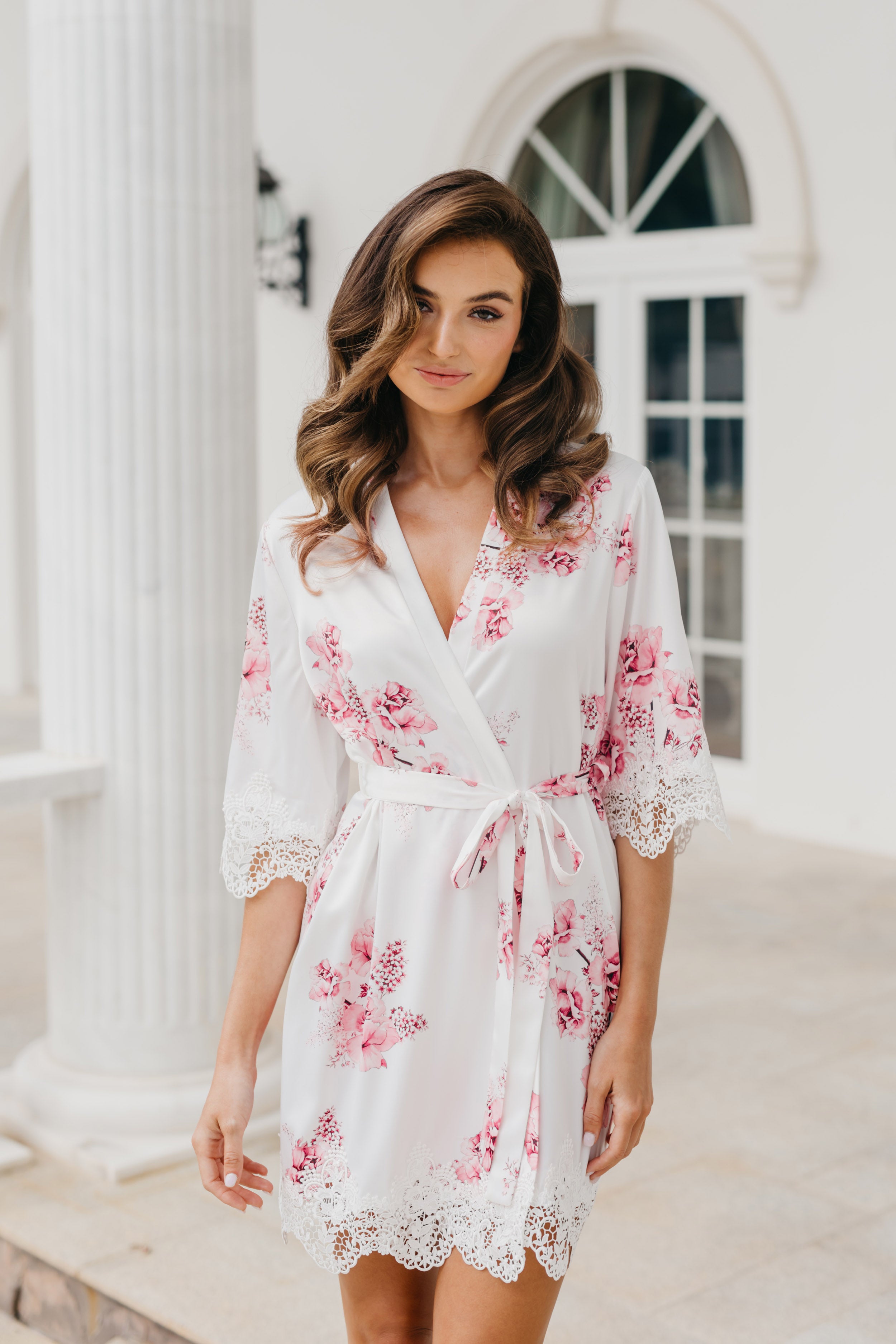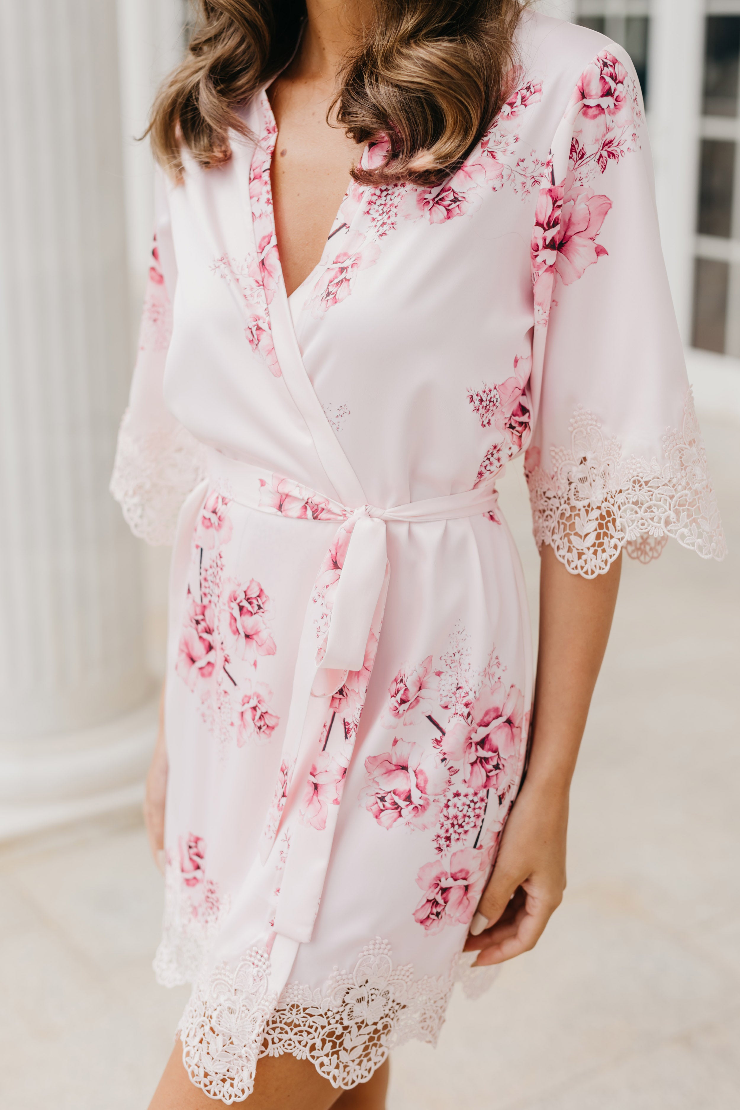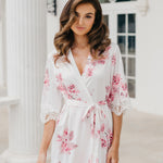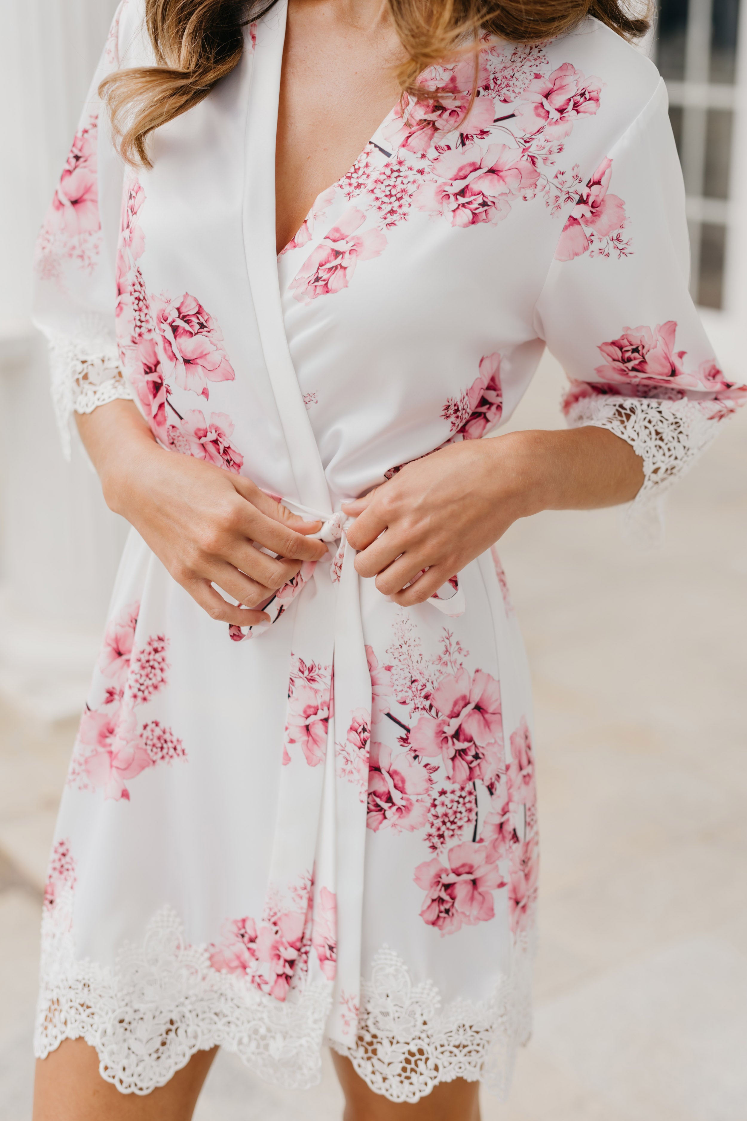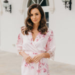 Wrap yourself in our exclusive 'Bouquet De Fleur' floral design printed on our Le Rose satin fabric developed by us for you. Our exclusive floral lace trim adorns the sleeve and hem.