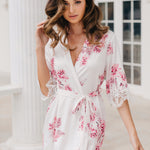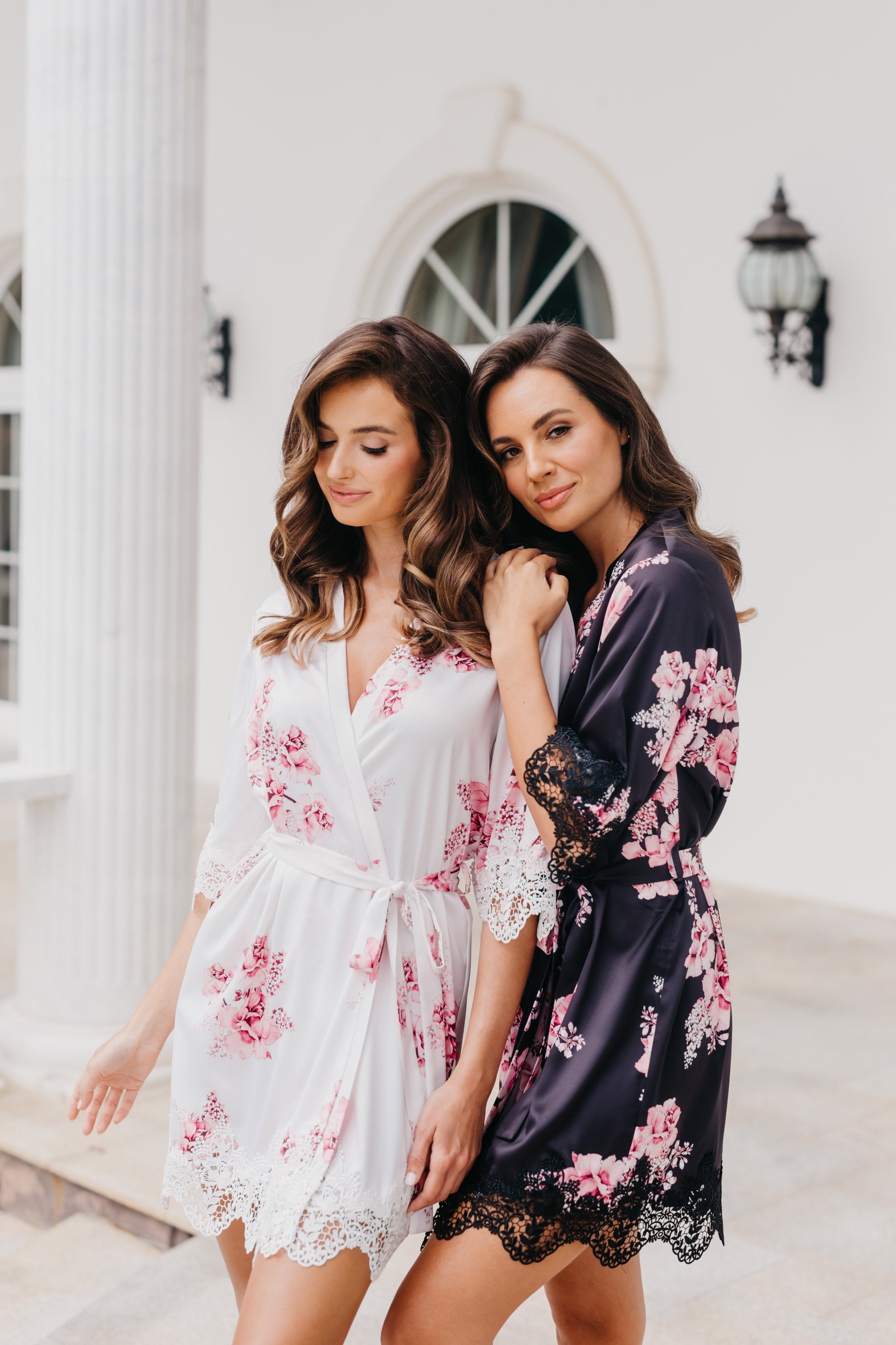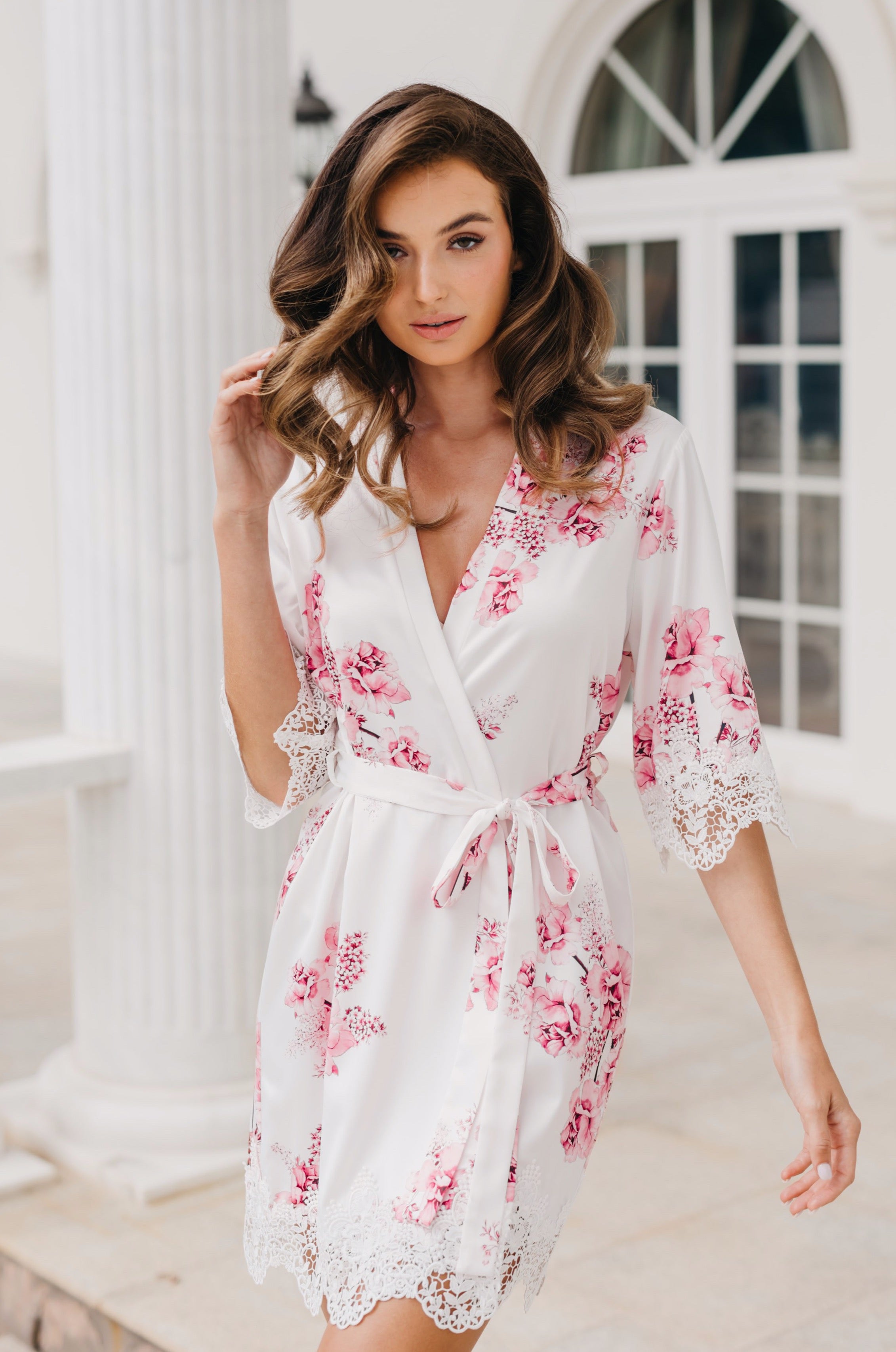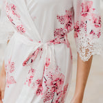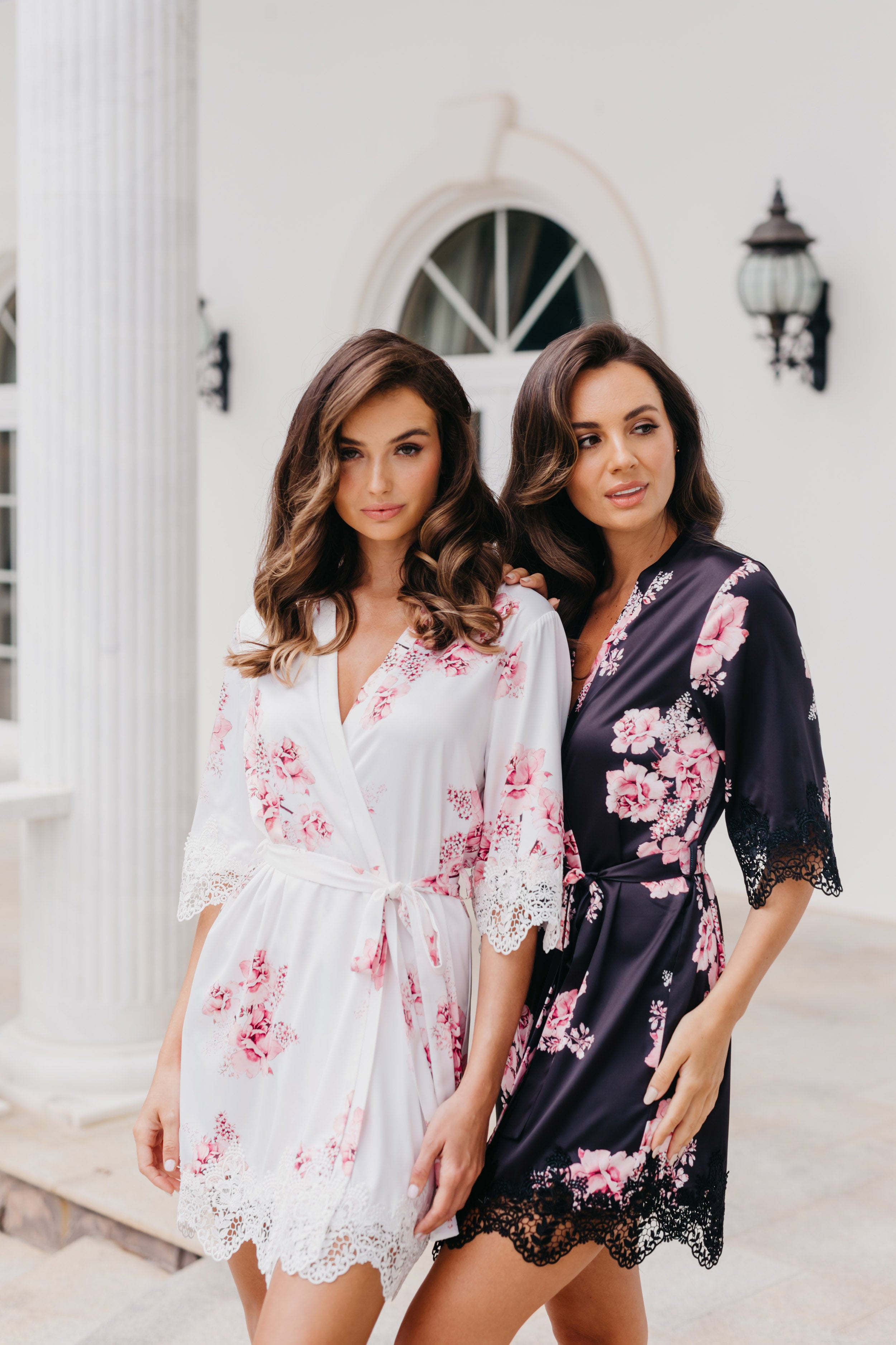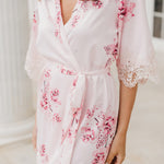 Wrap yourself in our exclusive 'Bouquet De Fleur' floral design printed on our Le Rose satin fabric developed by us for you. Our exclusive floral lace trim adorns the sleeve and hem.