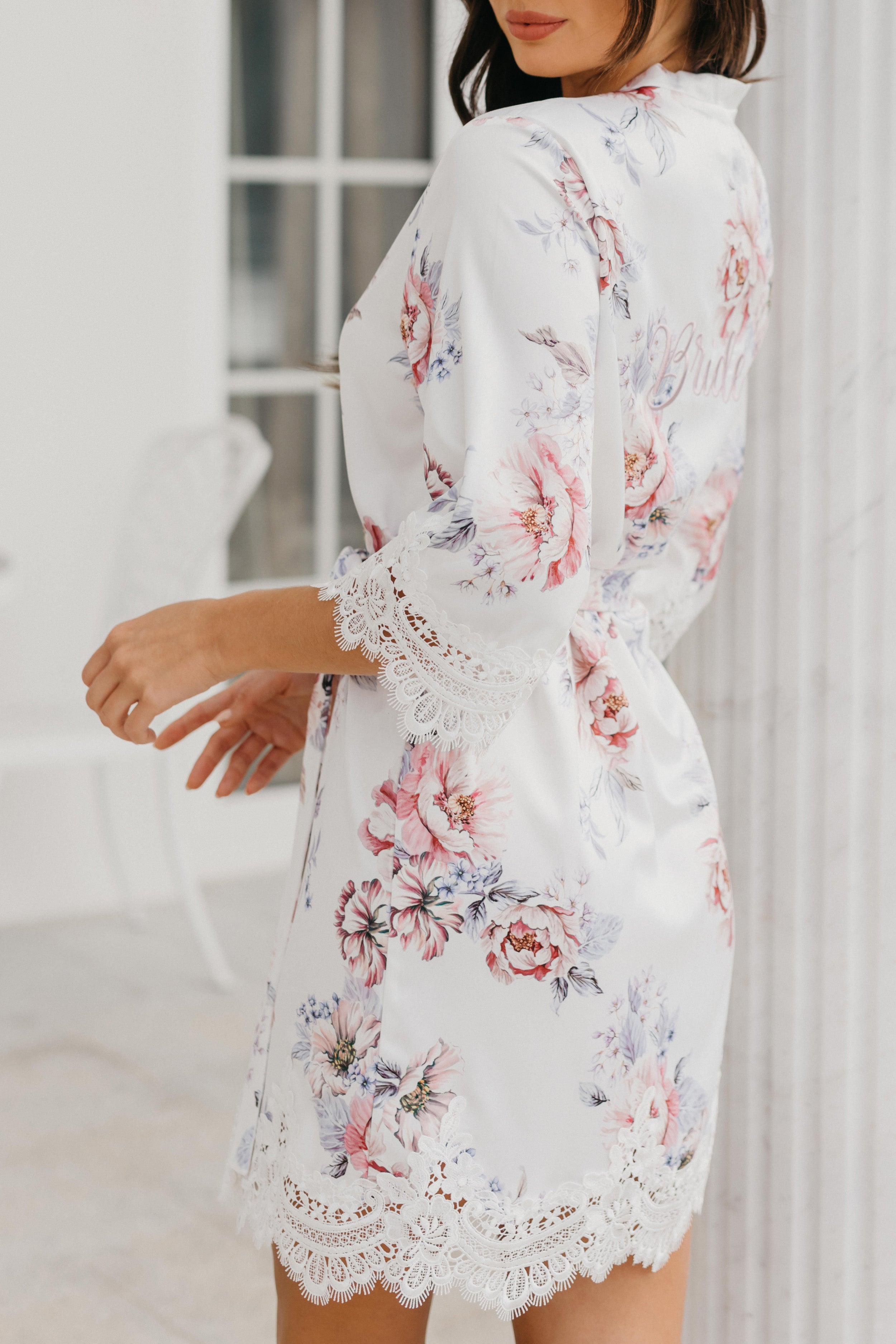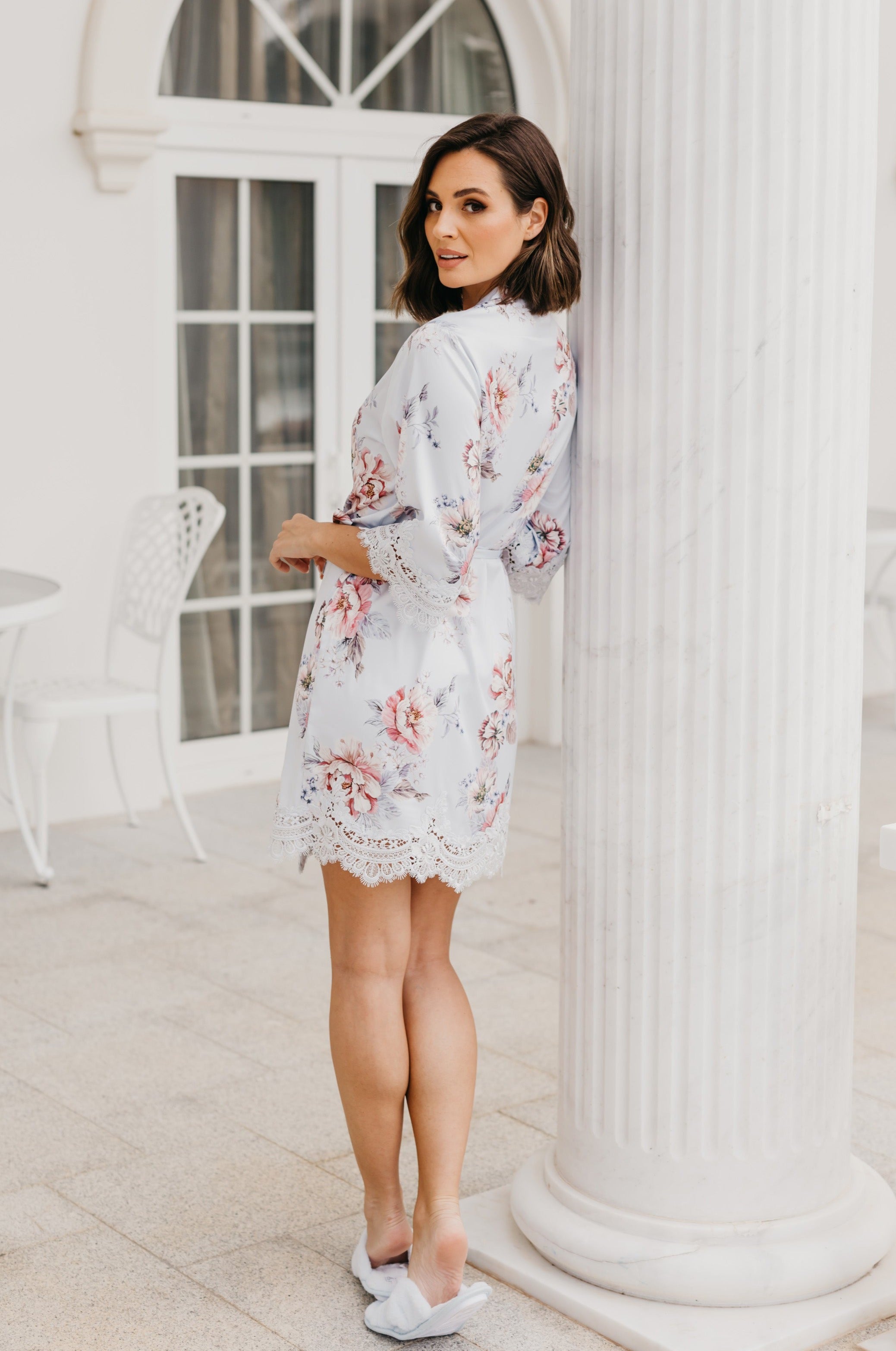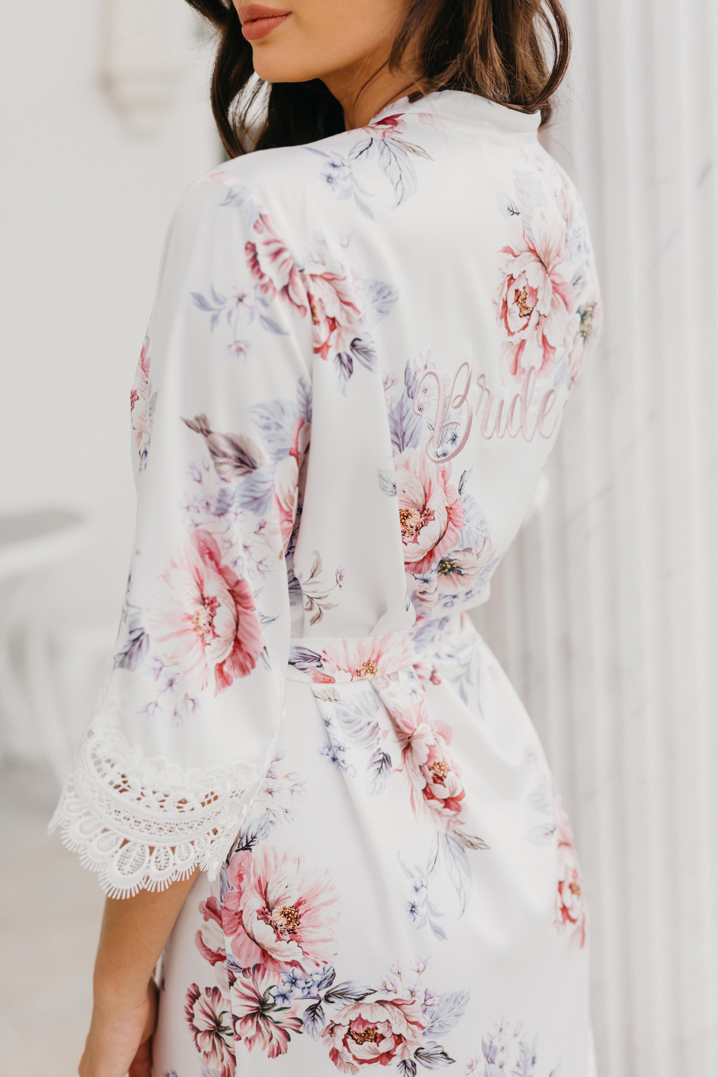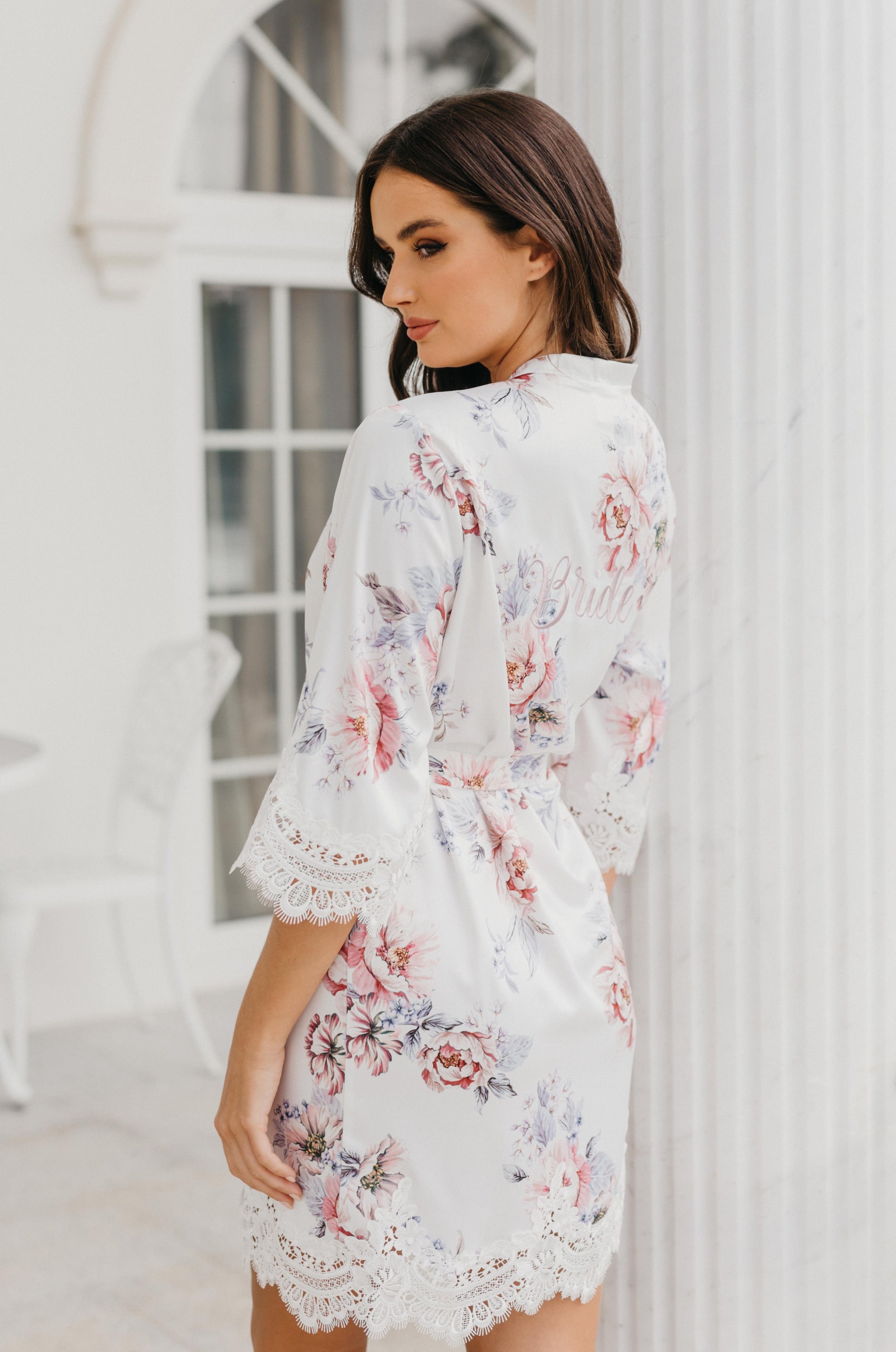Bridal robes and sleepwear are packed in soft white satin gift bags with ribbon and a gift card, then delivered in postal sachets.