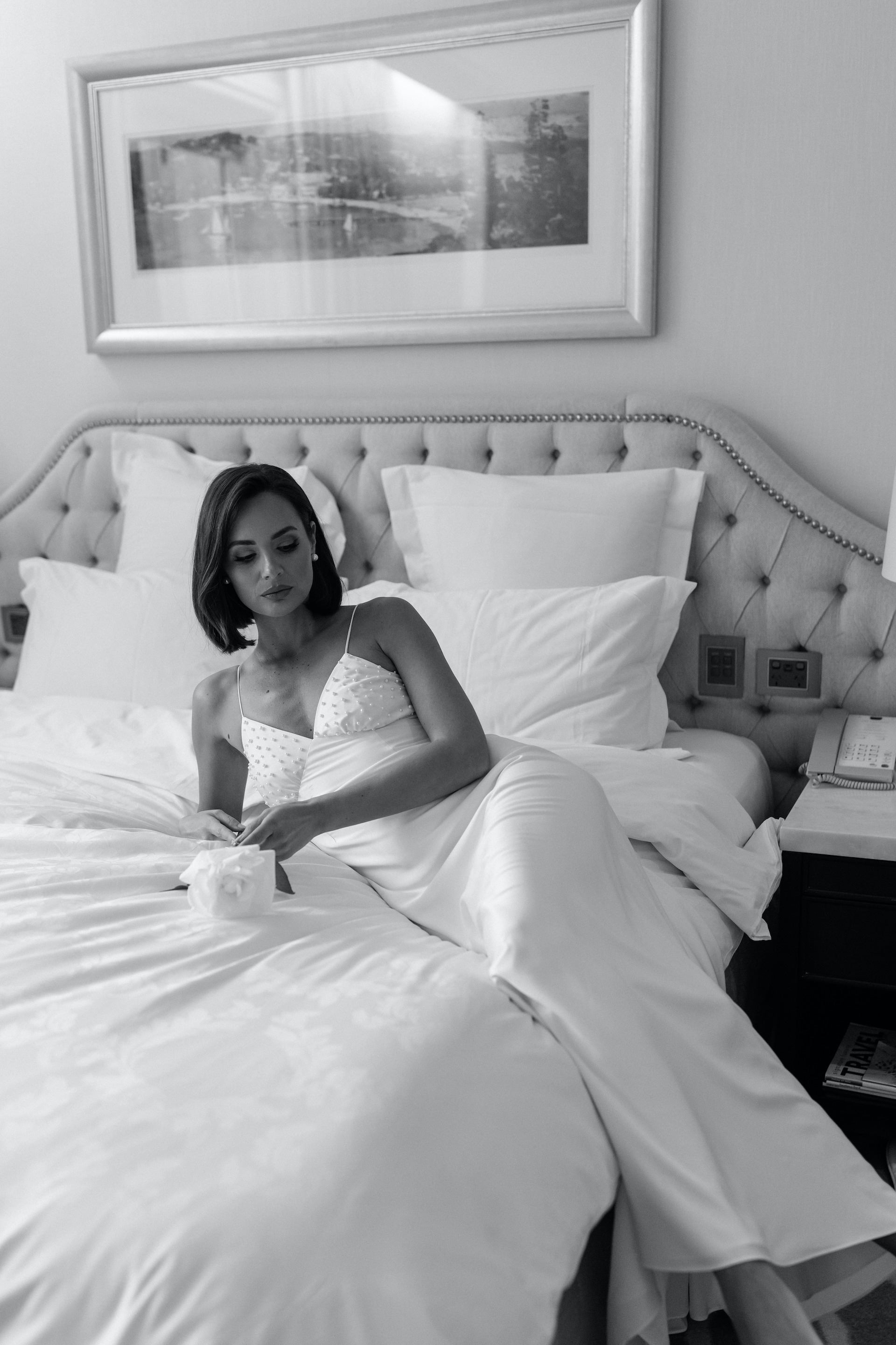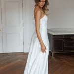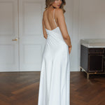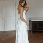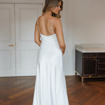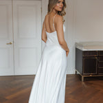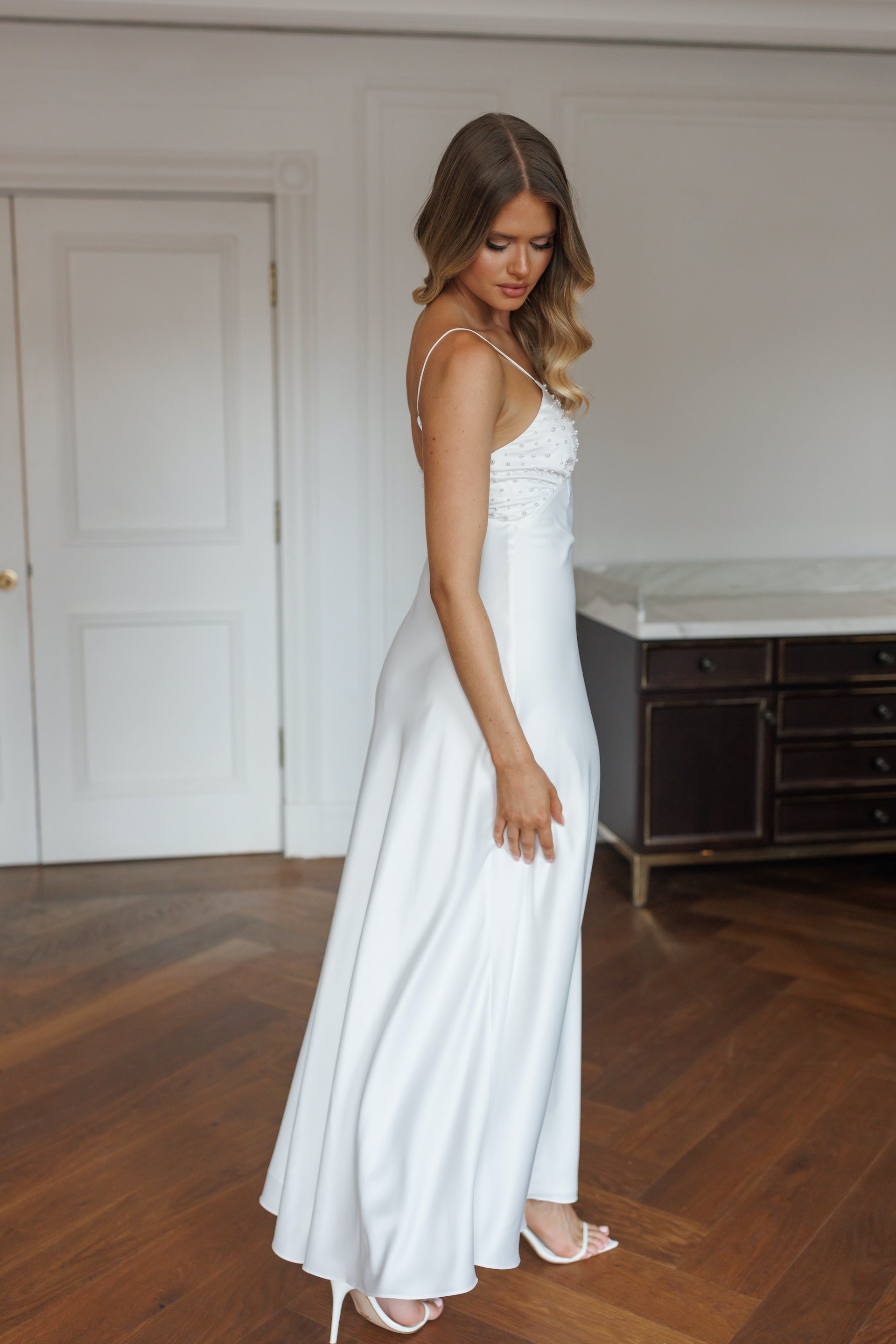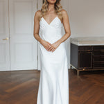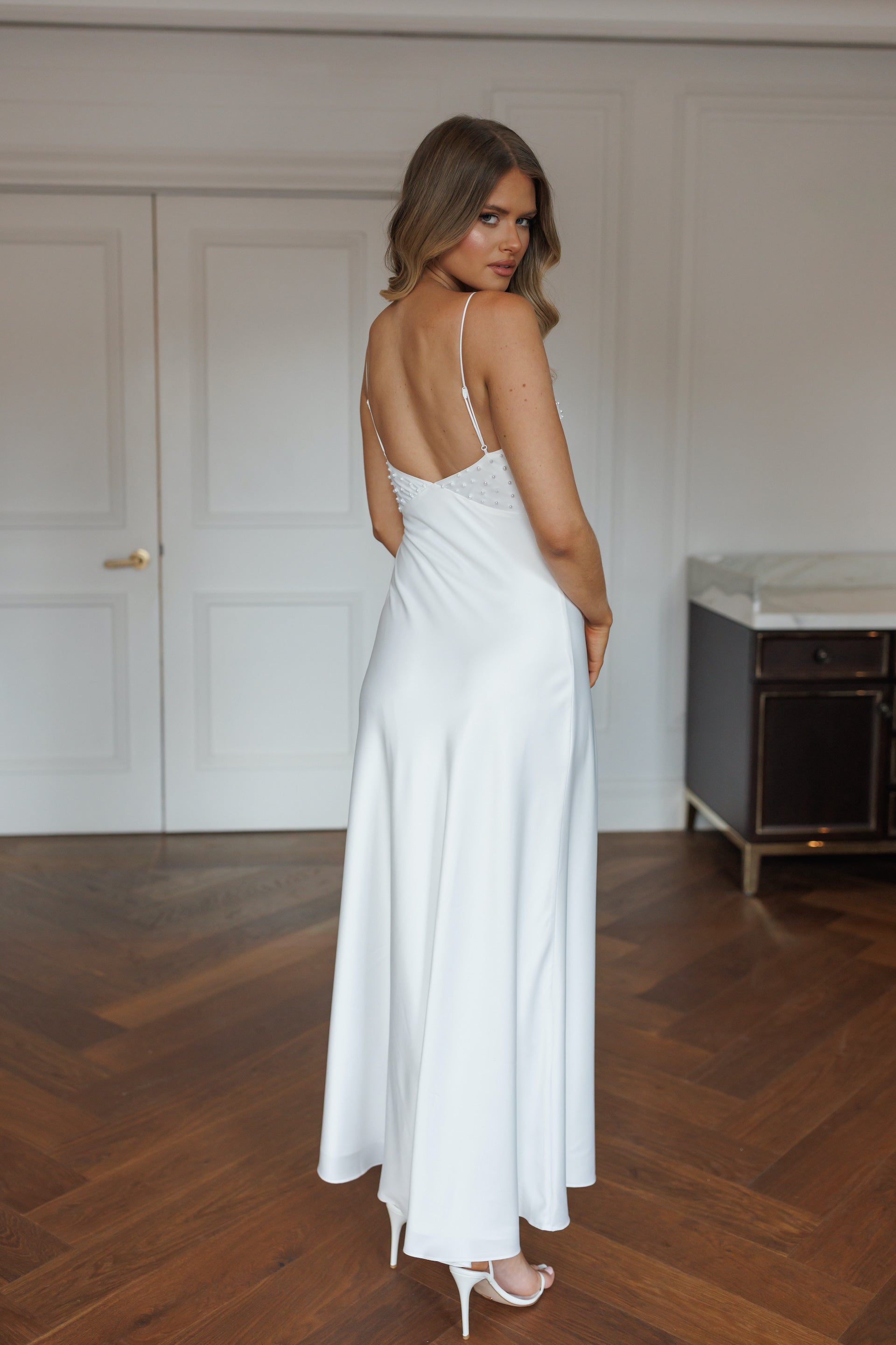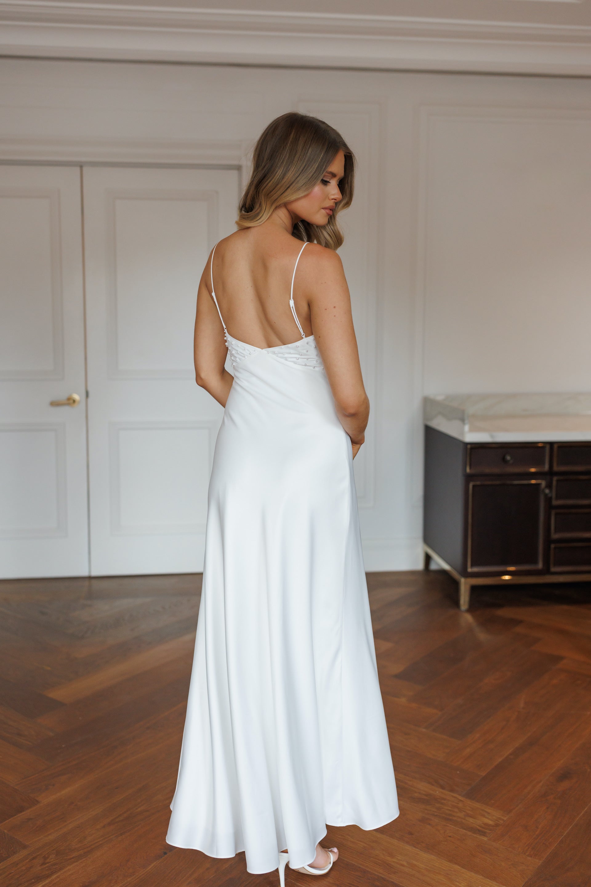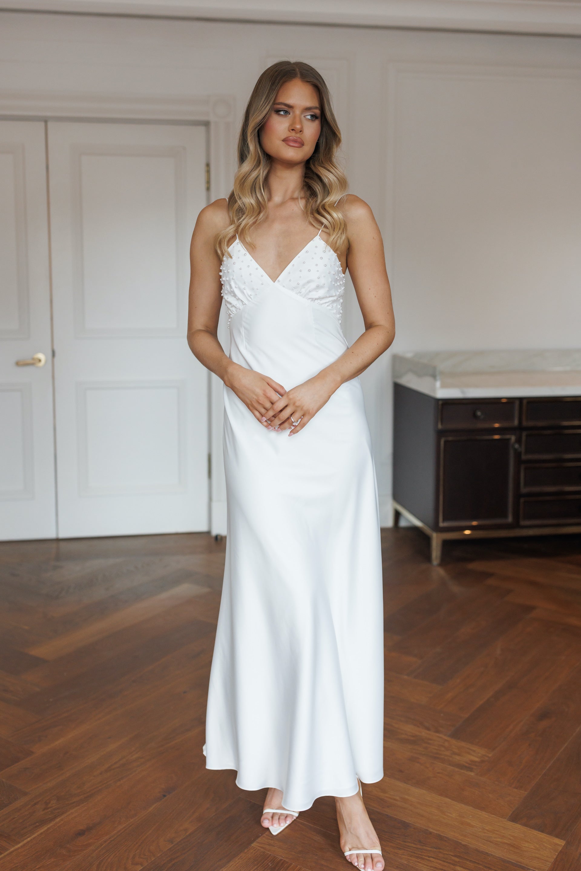 Beautifully constructed from our LR exclusive satin with soft lace detailing. It is bias cut and the front features scattered pearl beaded with a V shaped neckline and gathering at the bust. Adjustable straps at back allow for ease of taking off. Maxi length.