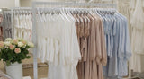 Bridal robes and sleepwear are packed in soft white satin gift bags with ribbon and a gift card, then delivered in postal sachets.