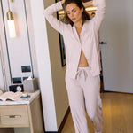 A semi-fitted shirt with a functional button front pairs effortlessly with full-length, elasticated pants featuring an adjustable drawstring waist.