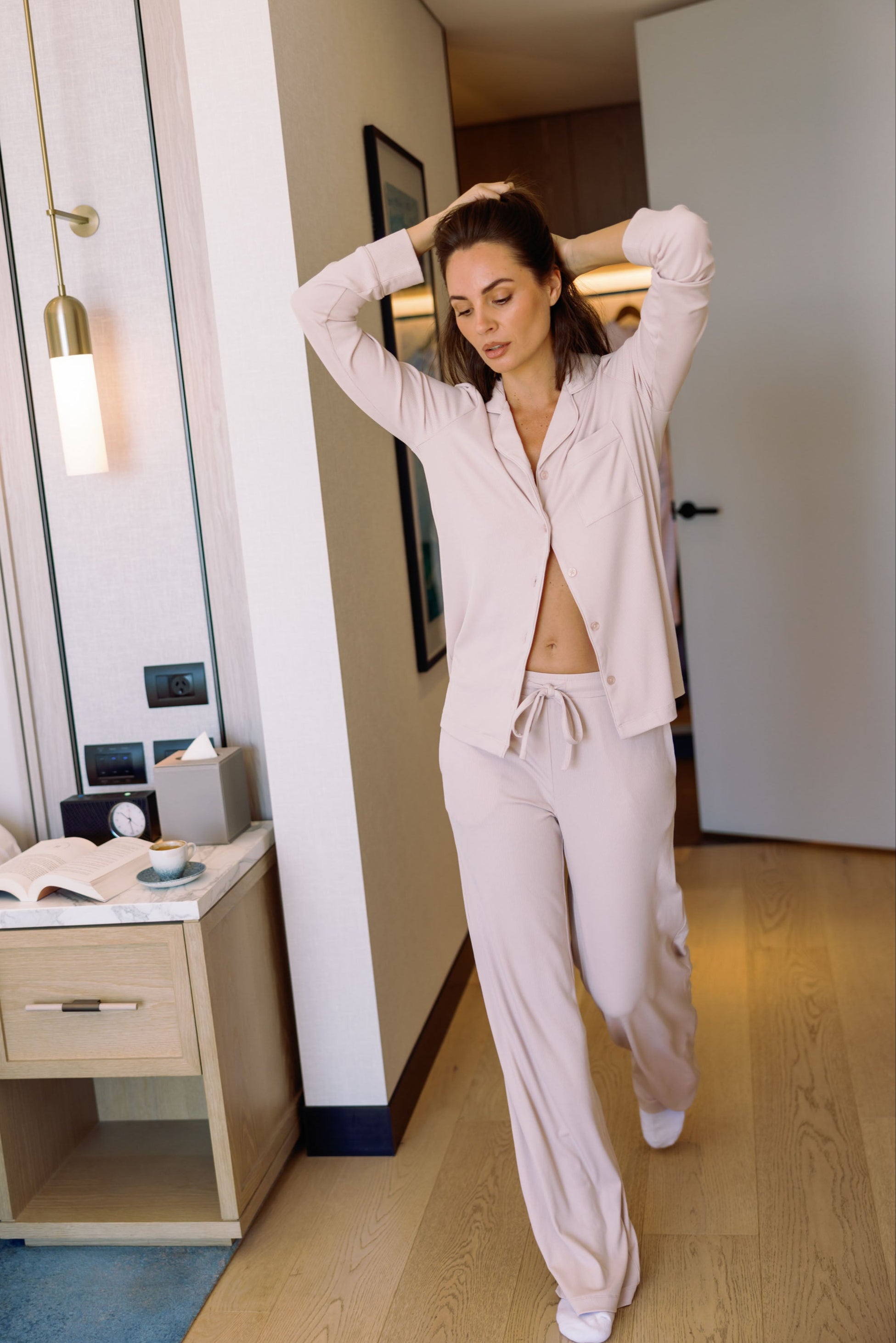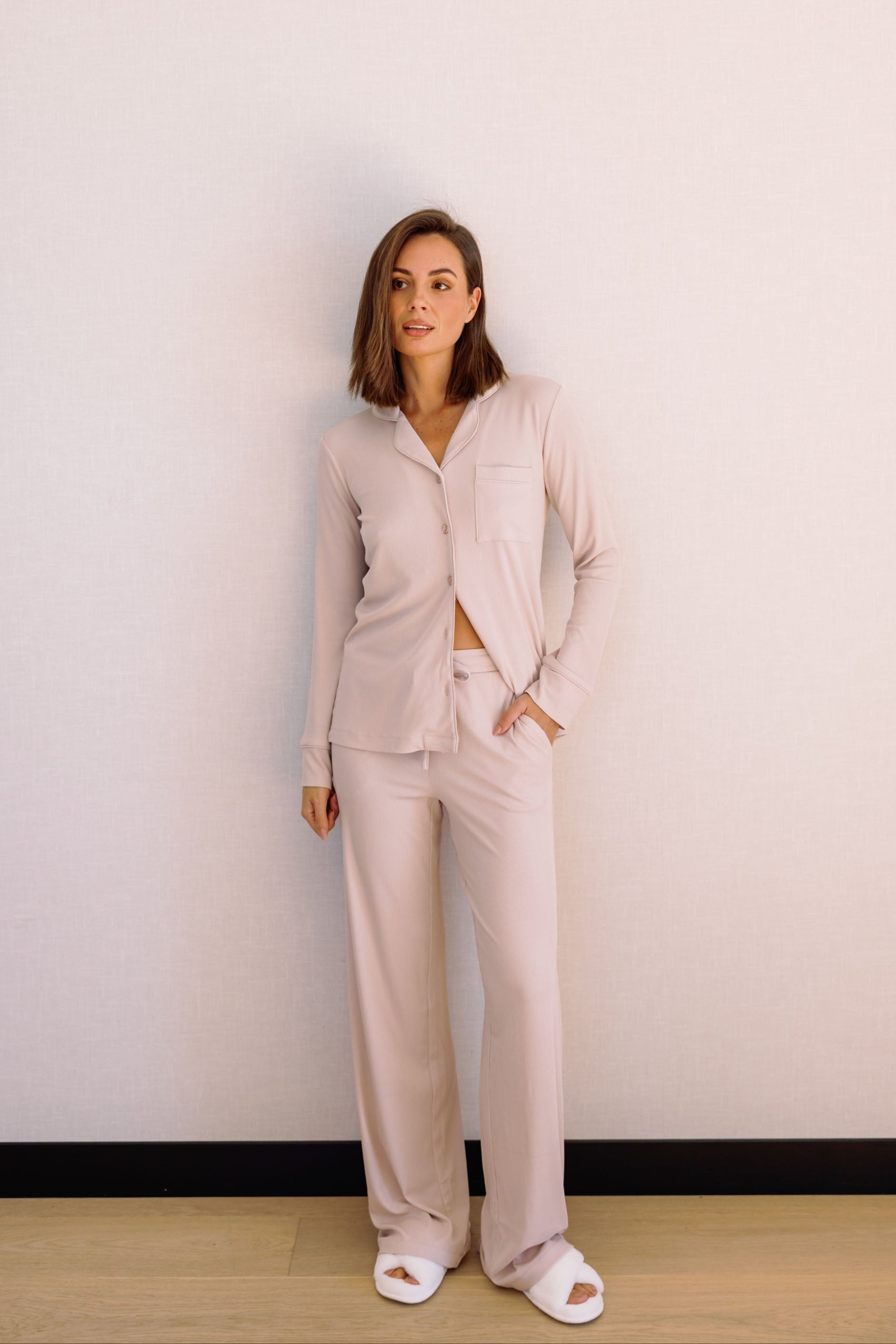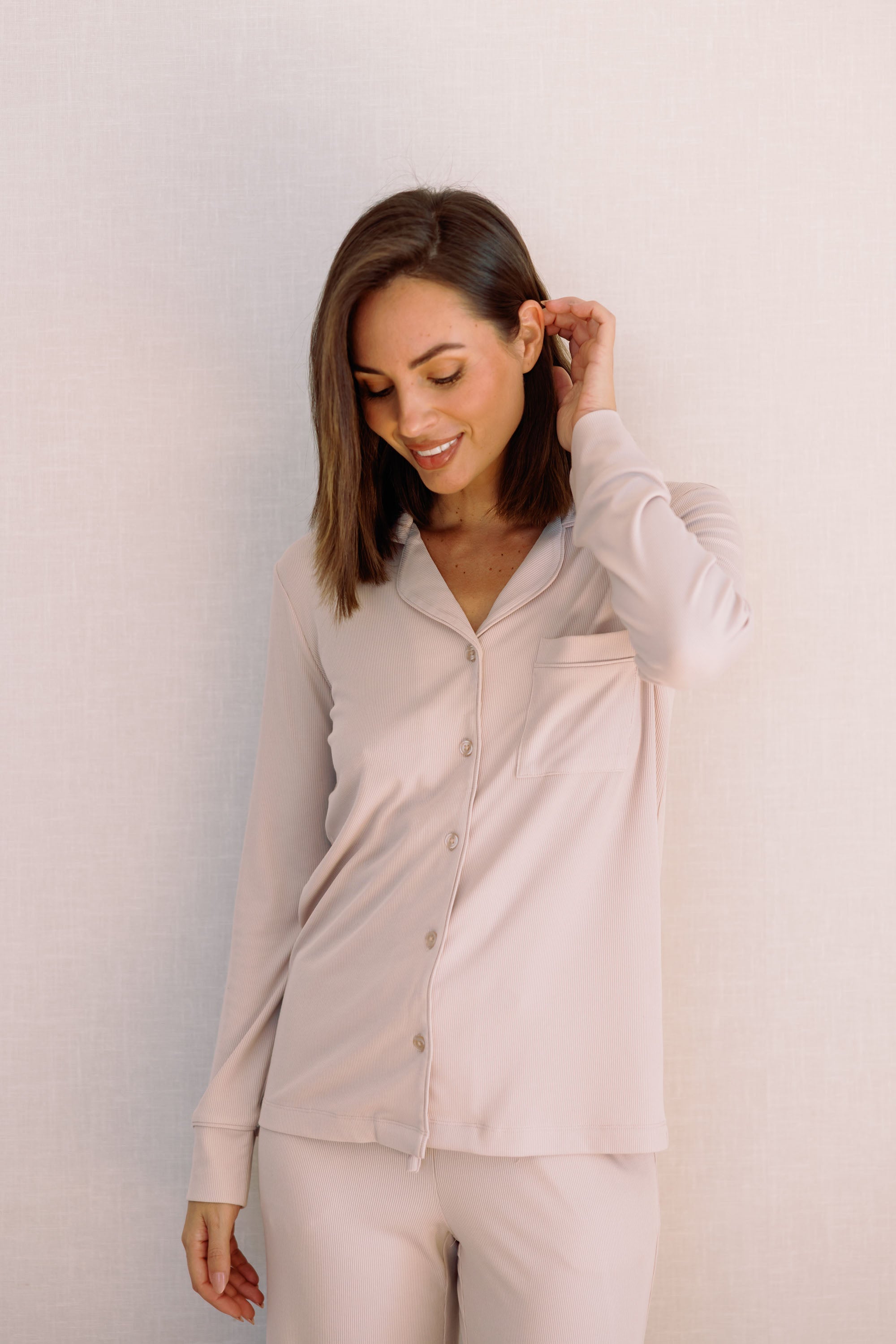 Effortless Luxury for Everyday Comfort. Wrap yourself in elevated softness with our Long Modal Ribbed Pyjamas in Champagne. Thoughtfully designed in a silky, breathable ribbed fabric, this lounge set is where comfort meets quiet sophistication. Perfect for slow mornings, indulgent evenings, and everything in between.