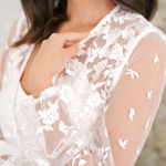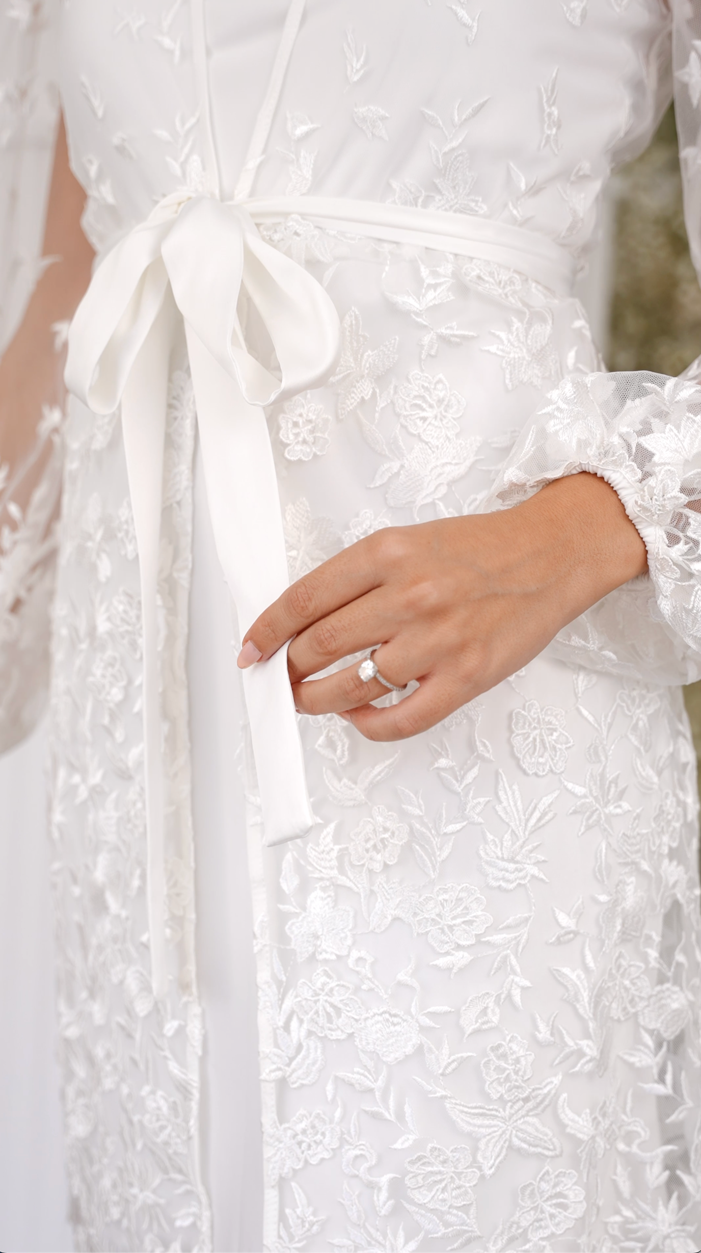 A light turned on. An eruption of love. Winter came to Spring. This is our Lumiere Bloom collection. With love in your heart and flowers on your sleeve, the Maya lace robe is perfect for the Spring bride.